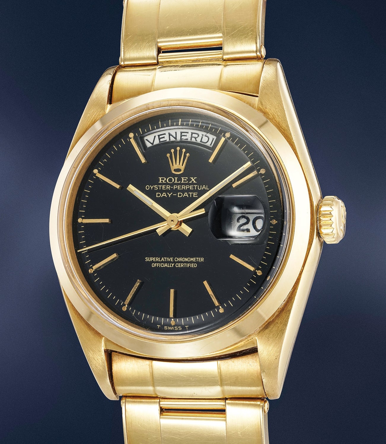 A highly rare and attractive yellow gold calendar wristwatch with black lacquer dial, bracelet, guarantee and presentation box