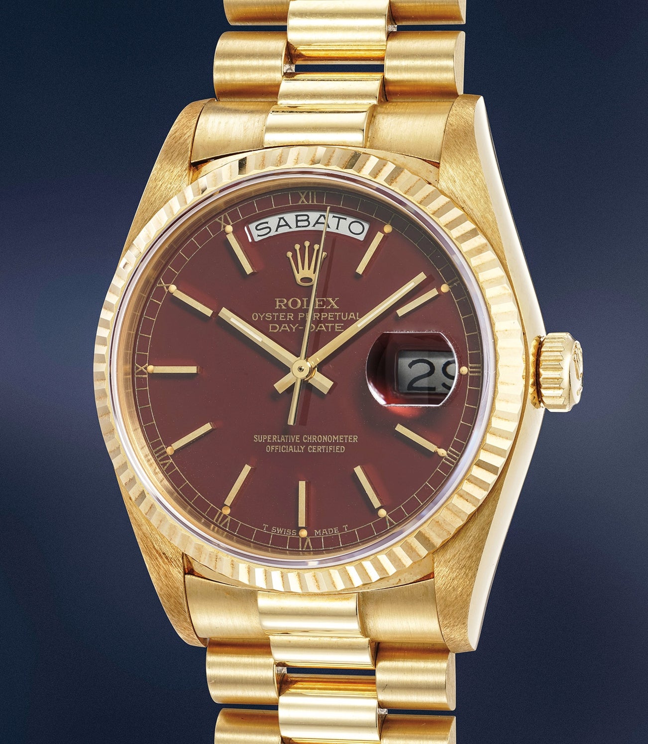 Reference 18038 is one of the last models to be fitted with extraordinarily attractive lacquer dials (dubbed “stella” - “star”, in Italian - by Rolex), such as the case for the present watch, featuring an immaculate burgundy Stella dial.