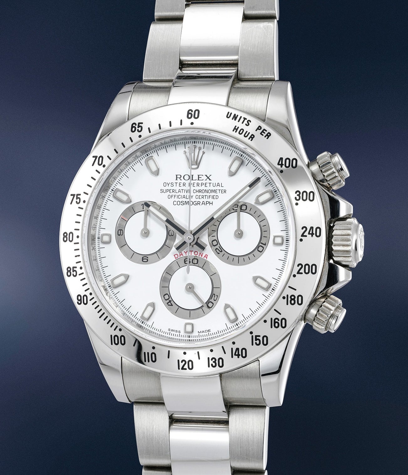 The present watch is an extremely rare variant within the 116520 family, and is nicknamed the "APH Daytona" due to its dial configuration. Produced between approximately 2011 to 2014, this version displays a gap between the "R" and "APH" in "Cosmograph" on the dial. It is incredibly rare to find this dial version, no less in such original and crisp condition. The present watch is furthermore accompanied by its original guarantee and numbered hang tag.