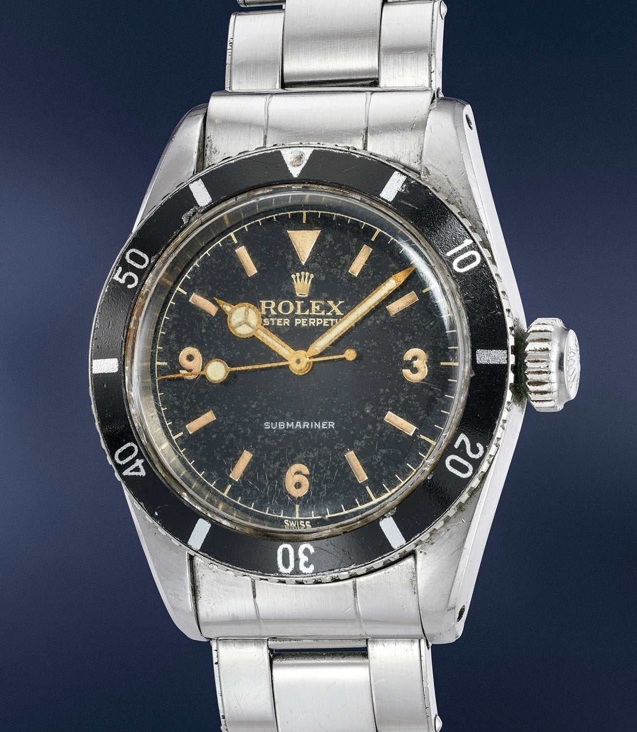 Introduced at the 1954 Basel Fair, the Submariner was Rolex's version of a water-resistant dive watch. While references 6204 and 6205 were water resistant to a depth of 100 meters, the more robust reference 6200 offered water resistance up to a depth of 200 meters. This model was nicknamed the “Big Crown” due to its oversized 8-millimeter “Brevet” crown that enabled cutting-edge water resistance. Of all reference 6200s, the most iconic variant is without a doubt one with an "Explorer" 3-6-9 dial like the present watch.