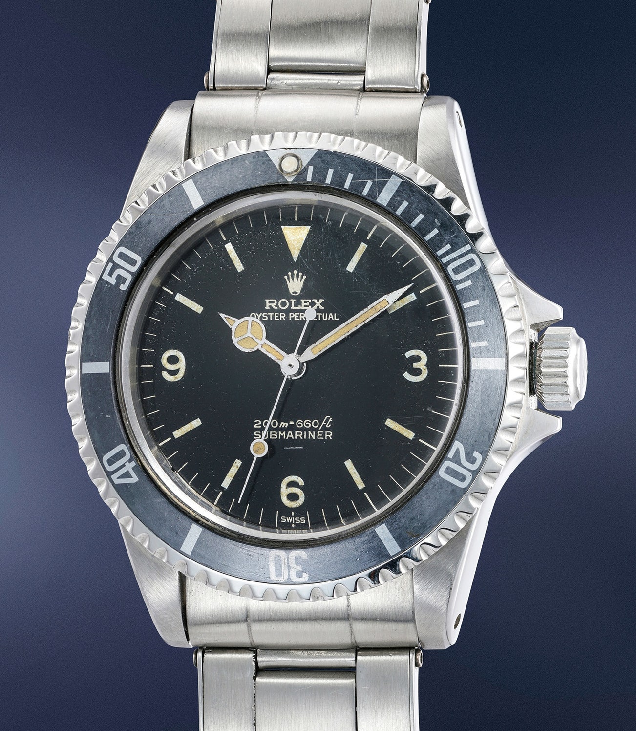 When analyzing this watch closer, one can spot another extremely exciting detail: an underline underneath the depth rating. The now nicknamed "underline" was used in the early 1960s to indicate a transition from radium to tritium on the dial. Furthermore, this dial configuration is correct for the 997xxx serial range. The watch itself is preserved in excellent and attractive condition, with sharp bevels and crisp edges throughout. It displays pointed crown guards, which is characteristic of the period.