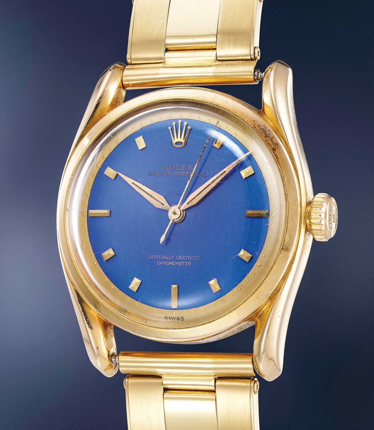 An extremely rare and most attractive yellow gold wristwatch with bombé lugs, blue enamel dial and bracelet