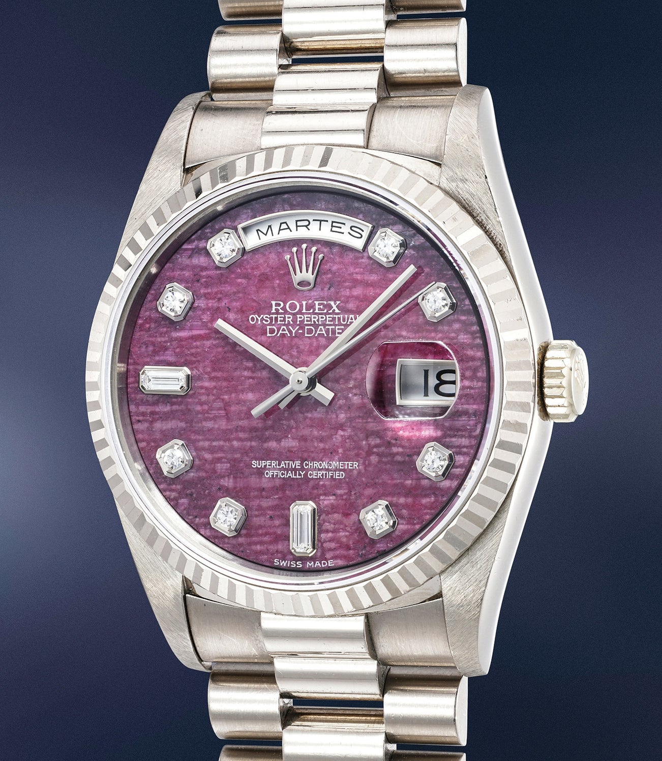 Hardstone dials are among the most attractive and collectible dials to have ever found their way into the Day-Date line. Beyond the present rubellite, other stones have been employed by Rolex: onyx, grossularia, malachite, marble, agate and jade are just some examples of this remarkable diversity.