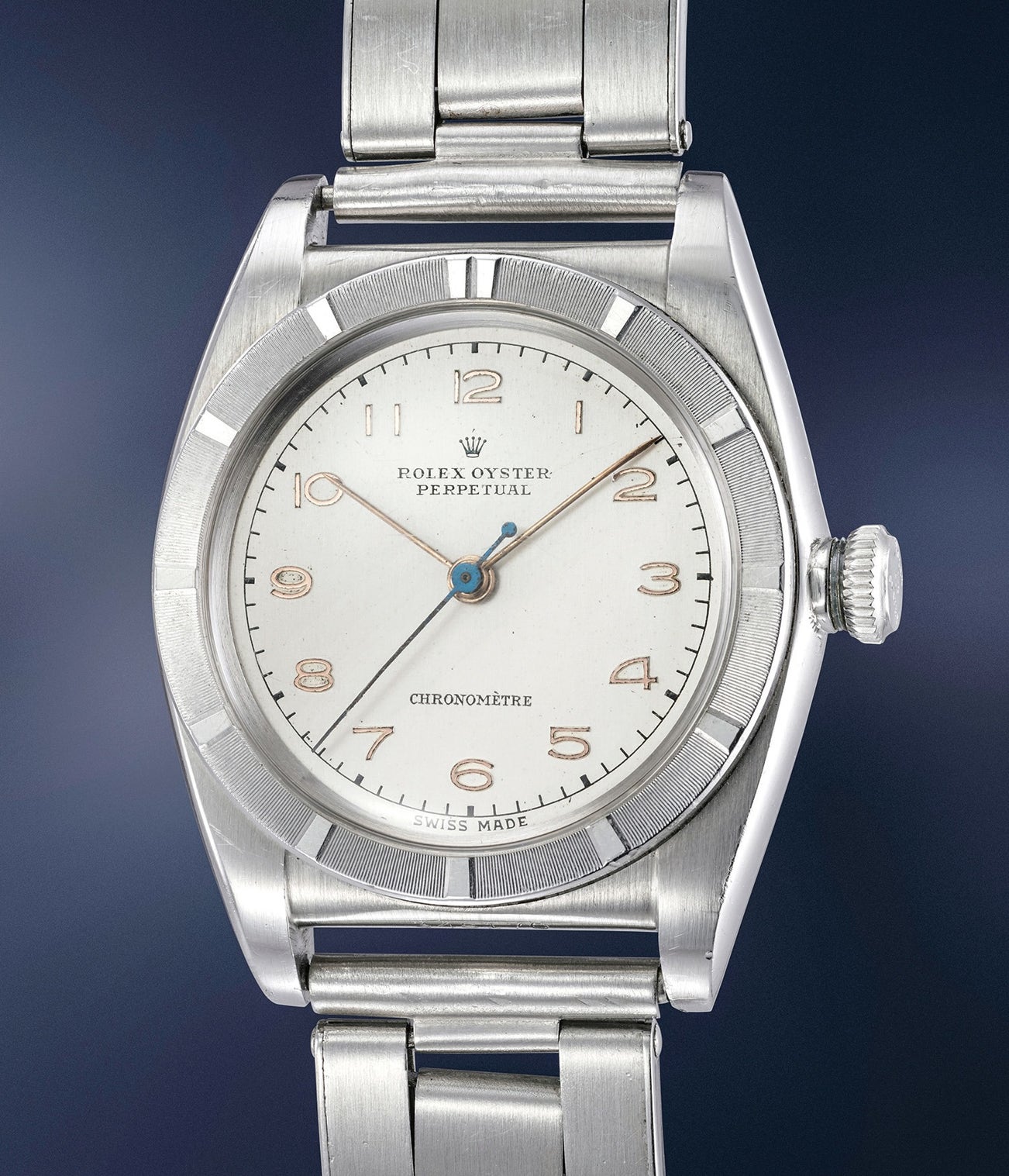 Reference 3372 was first introduced to the market in 1940. At the time of production, the model’s appearance was very unusual. The watch featured a 'machine' bezel, showcasing a threaded design that is still very appealing and eye catching today. Displaying a very impressive bezel and definition to the case, this "Bubble Back" is preserved in most probably unpolished condition. The dial is also preserved in astounding and almost unblemished condition, which is particularly astounding considering the age of the timepiece.