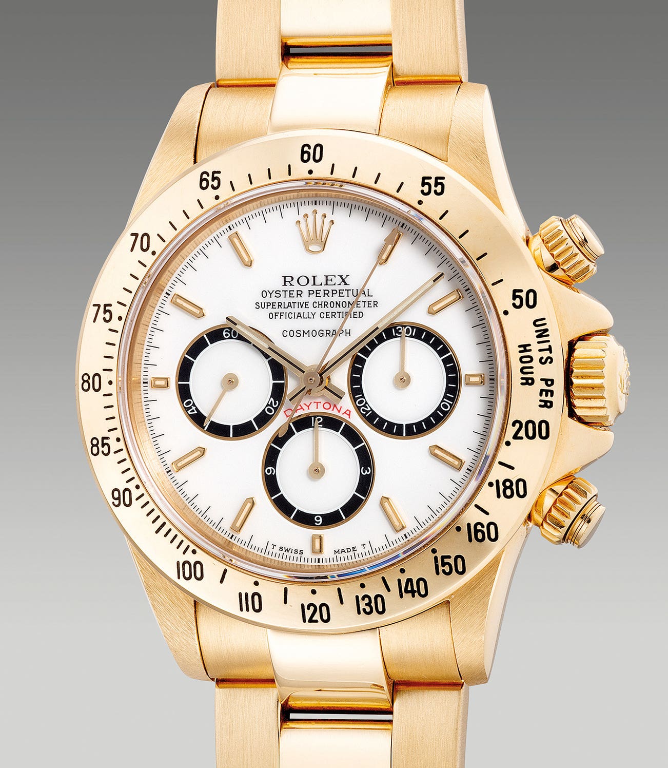 An extremely rare and highly attractive yellow gold chronograph wristwatch with “Floating Cosmograph” white porcelain dial and bracelet