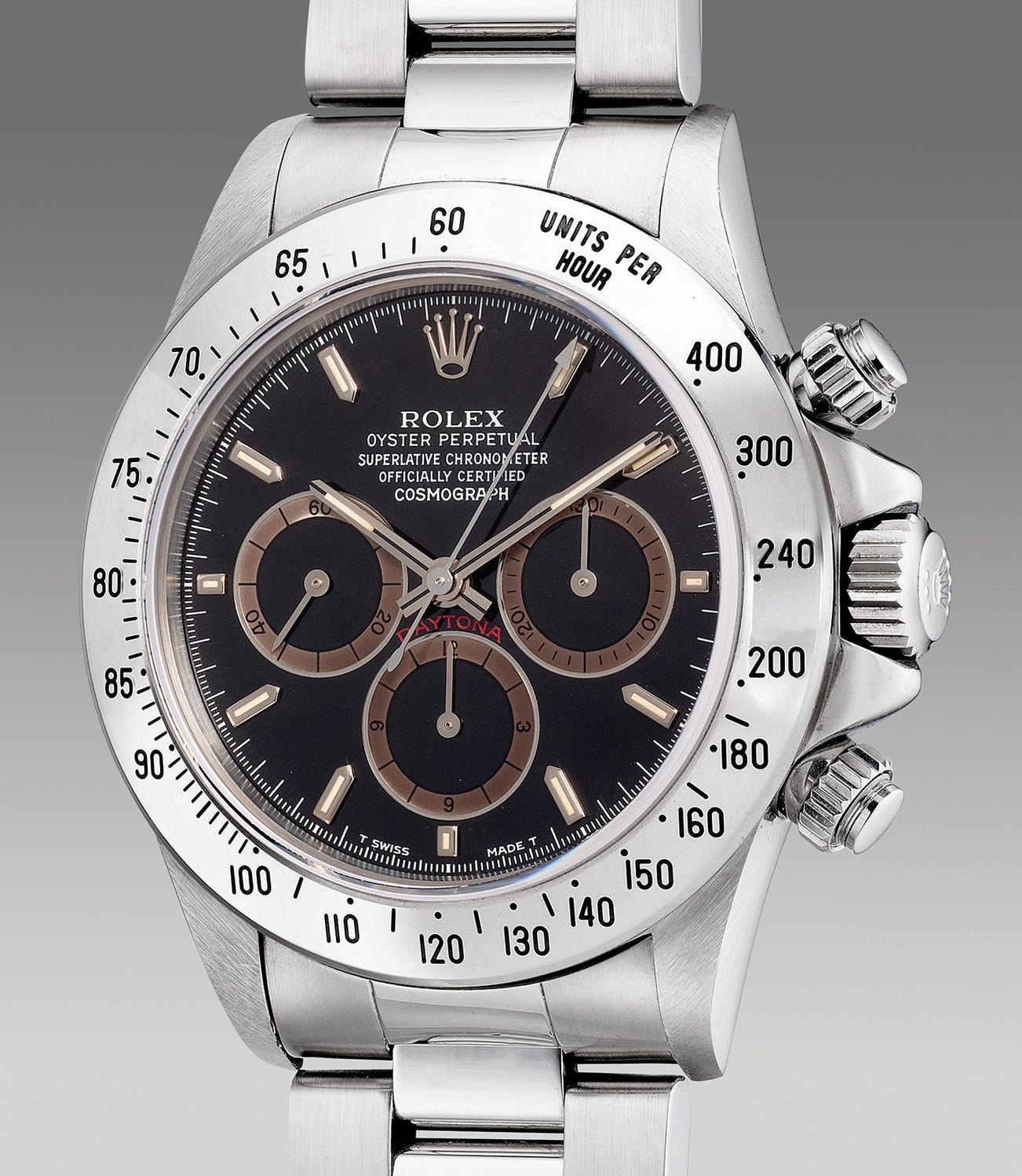 The present example bears an “S” serial from circa 1994 featuring a black “inverted 6” dial with “tropical” brown registers. The tropicalization of the registers are genuinely even with lighter shades of brown on the “60”, which can be a heartwarming factor for collectors to witness as it is a sign that has been developed naturally. Offered with the original Rolex guarantee from the U.S confirming its black dial and dated 1995, the present timepiece is also well-preserved and rare example of the coveted Rolex Cosmograph Daytona ref. 16520.