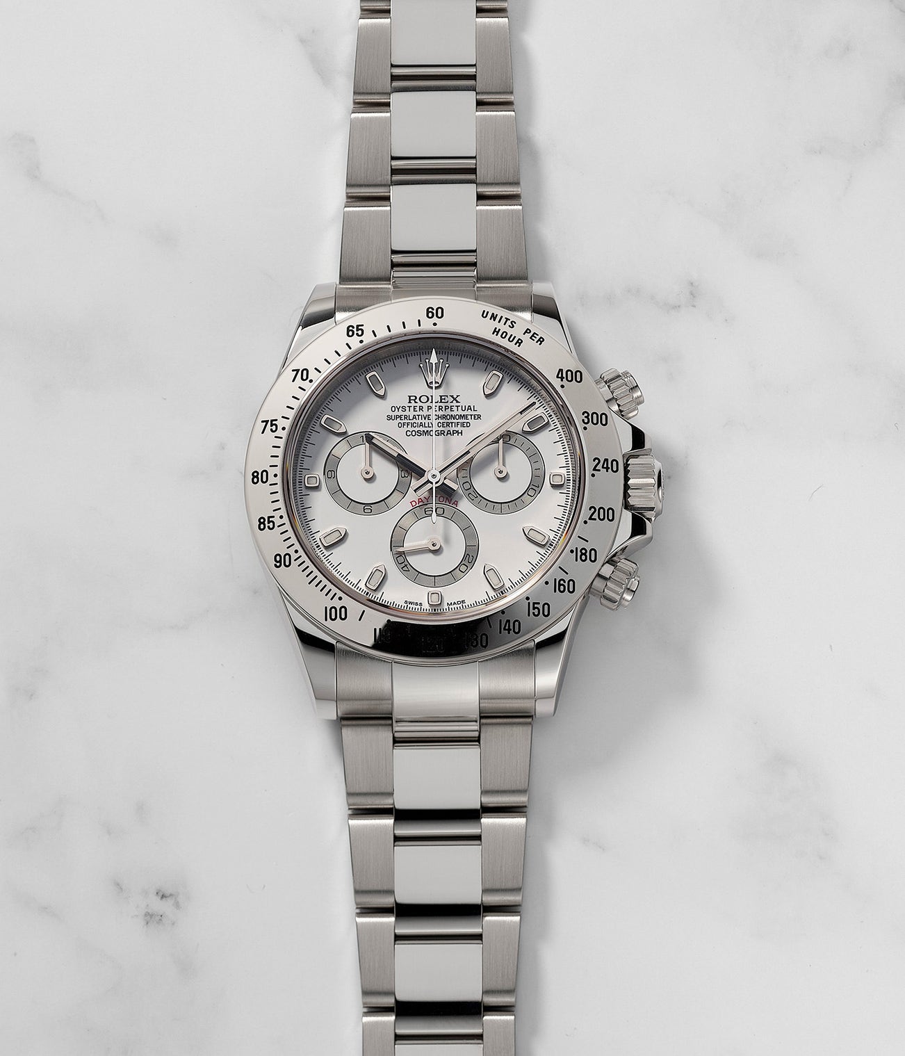 The present watch is an extremely rare variant within the 116520 family, and is nicknamed the "APH Daytona" due to its dial configuration. Produced between approximately 2011 to 2014, this version displays a gap between the "R" and "APH" in "Cosmograph" on the dial. It is incredibly rare to find this dial version, no less in "new old stock" condition, like the present example. Displaying all its original factory stickers, it is in almost the same condition as it left the Rolex factory.