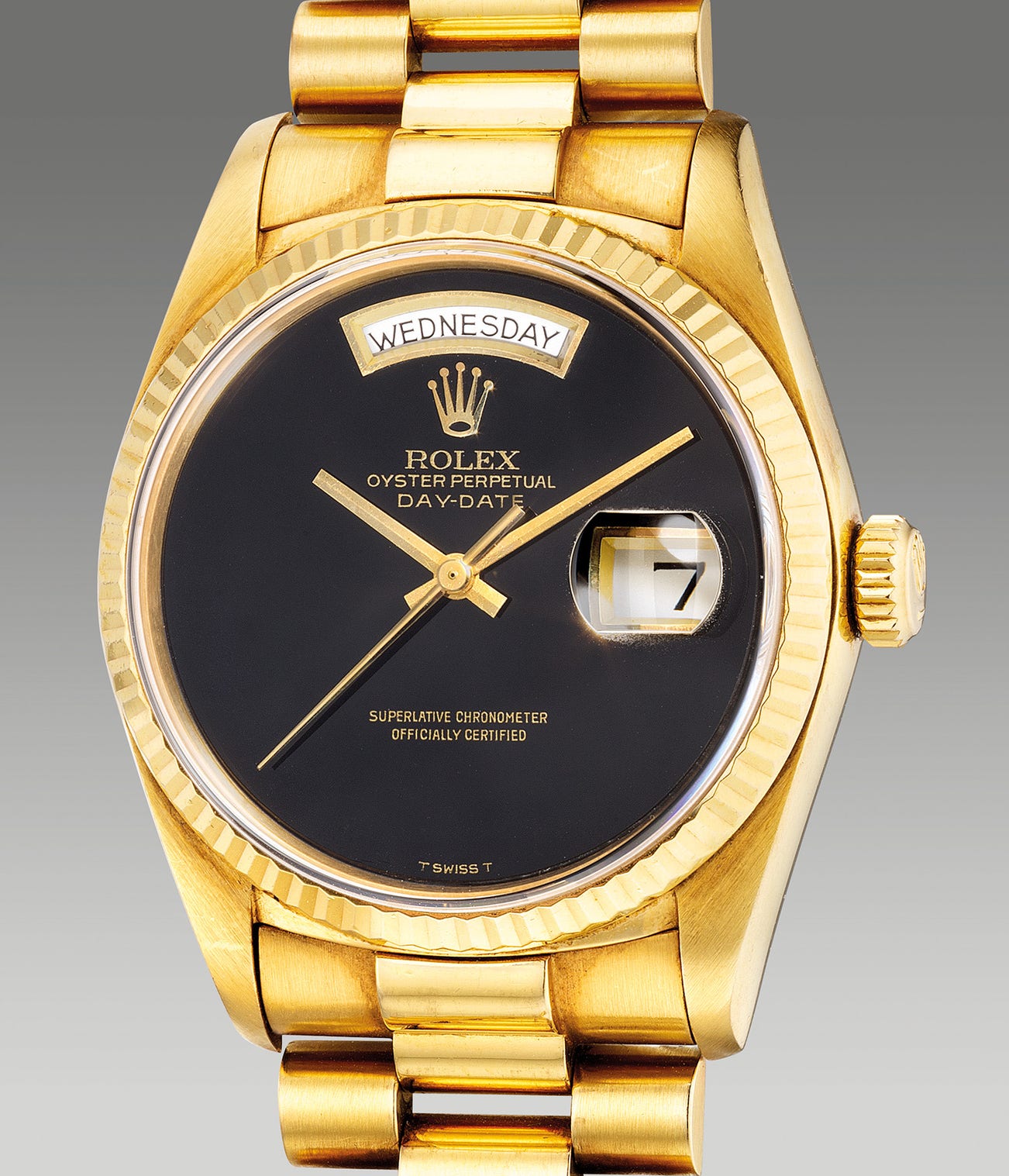 A rare and attractive yellow gold wristwatch with center seconds, day, date, “onyx” dial, bracelet and guarantee