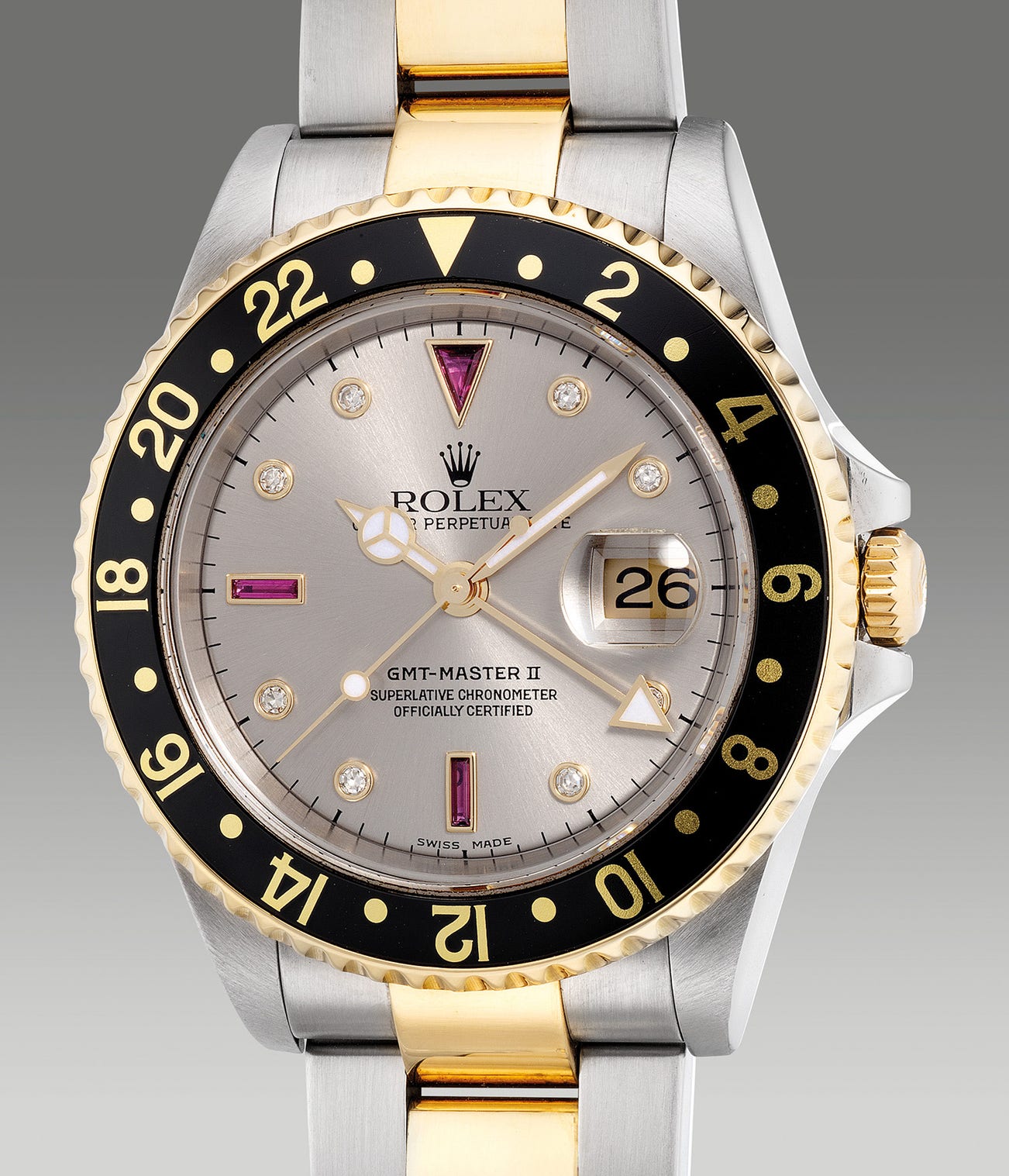 The present Rolex GMT-Master II reference 16713 was produced alongside its stainless steel counterpart reference 16710 from the end of the 1980’s up to the early 2000’s. The attractive silvered dial is set with 8 diamond indexes and 3 rubies giving the watch its nickname “Sultan”. Powering the watch is the Rolex caliber 3185 offering a hacking second feature and the ability to set the hour hand independently from the GMT hand for easy time adjustments.