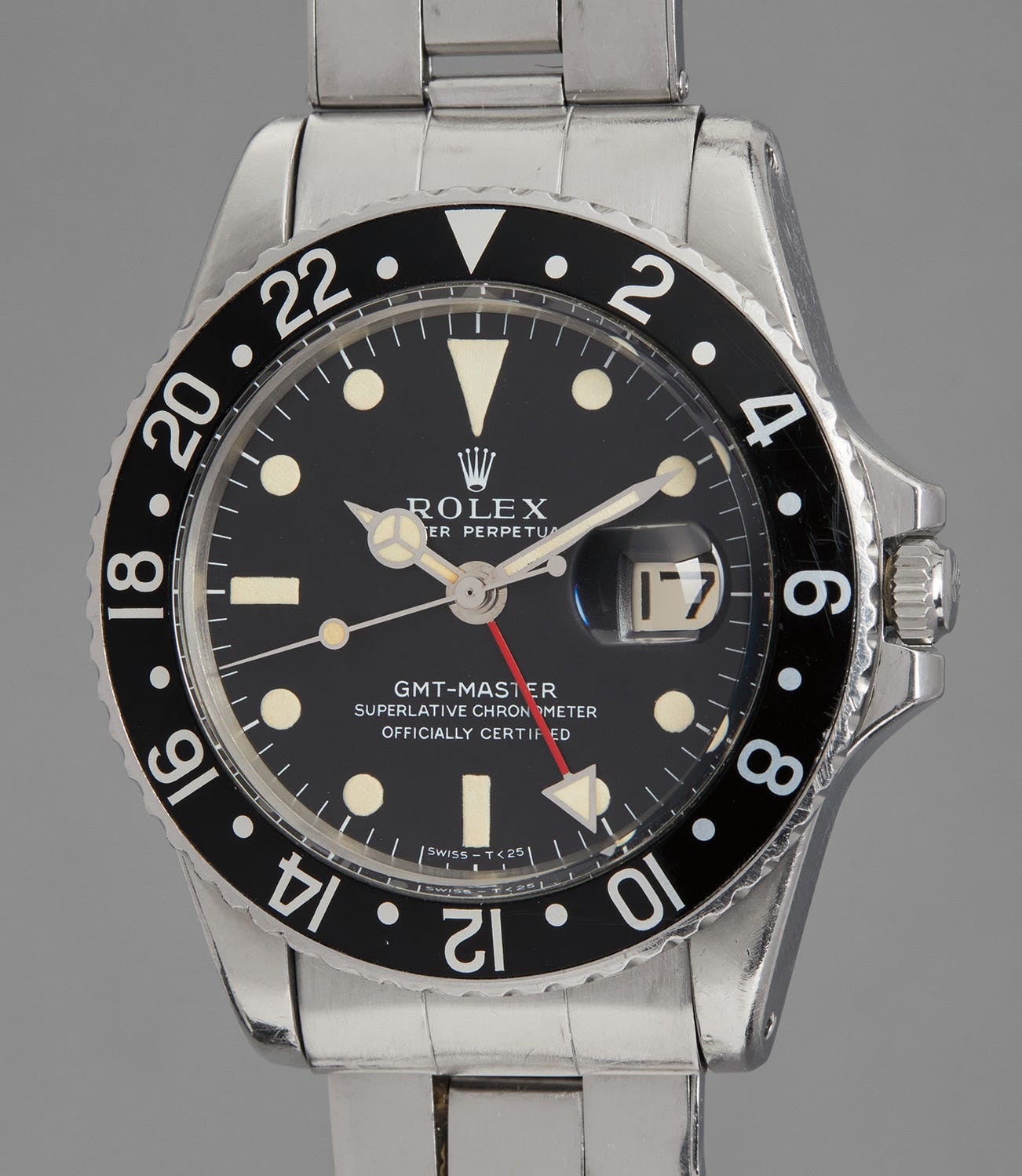 Consigned by the original owner, the present watch is offered in unpolished condition and with an attractive dial bearing a 2.0 million serial from approximately 1970. It represents a classic Mark I example identified by its distinguishable coronet and “long E” dial. It further displays the large triangle on the GMT hand.