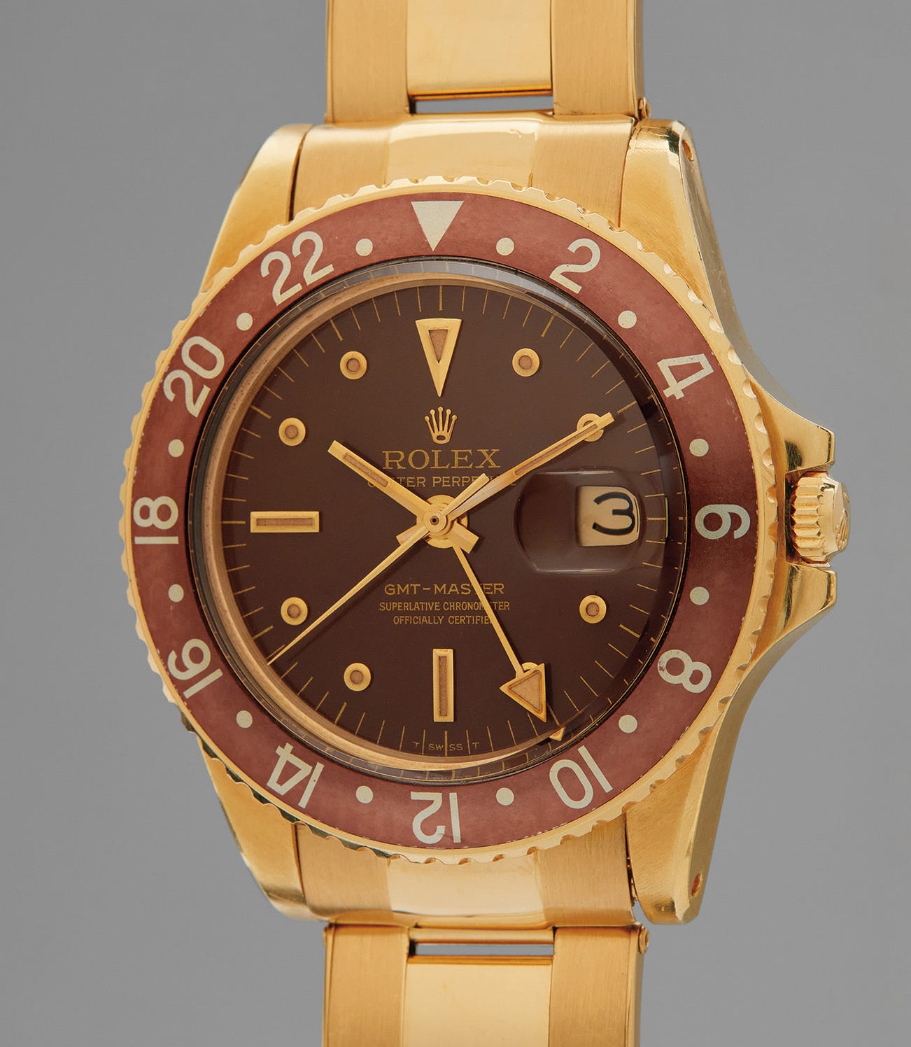The present example is in yellow gold is a very rare and sought after “Concorde” variant. Around 1969, Rolex published a series of advertisements stating "If you were flying the Concorde, you'd wear a Rolex" showing a yellow gold reference 1675 displaying baton hands, collectors consequently bestowed the “Concorde” name on this rare and attractive variant. The rich, lacquered brown dial features applied gold, nipple-shaped luminous hour markers, that beautifully complement the yellow gold case. The mahogany brown color of the dial perfectly bezel, and combined with the large, 39 mm case, provides a strong masculine aesthetic.