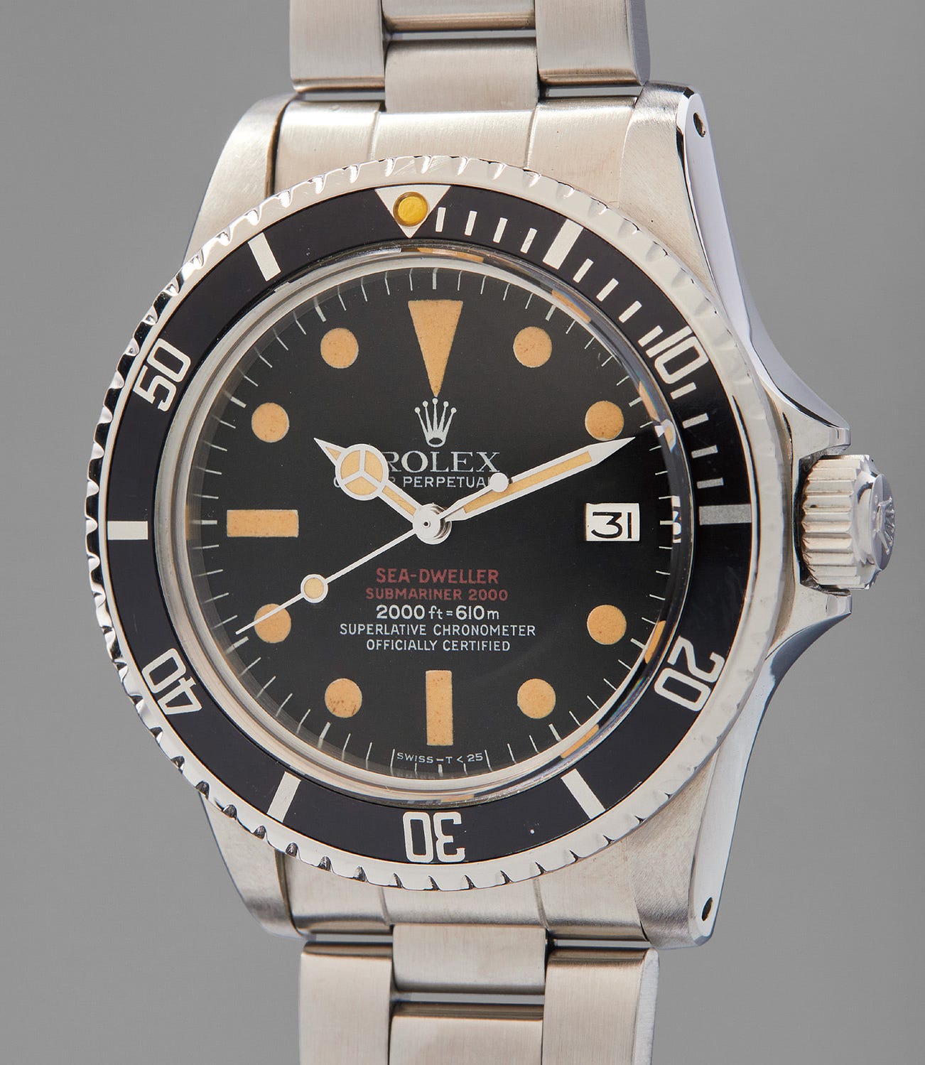 The present watch is fitted with a Mark IV dial with closed “6” numerals and is in excellent overall condition. Its dial is stunning, with its luminous hour markers having aged to a pleasing, warm beige color. The Sea-Dweller is a sporty and versatile watch that is both highly collectible and suitable for daily wear.