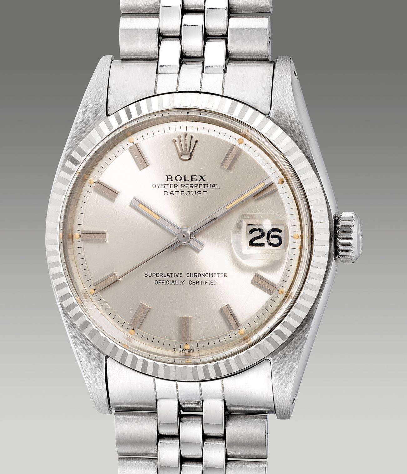 Preserved in excellent condition from a Japanese collector, the present example has a unique factor that earned a famed title the “Wide Boy” among collectors. Rare and produced in a short production run in the early 70’s, the “Wide Boy” features unusual block-like wide set indexes and handset. Cased in stainless steel, this example is a classic Datejust model that never goes out of style, it features a recessed silver sunburst pie-pan dial, subtly encircled by sharp angled bezel shimmering in precious white-gold metal. The combination of different shines from the metals complements each other gracefully. The stunning looks of this example is further charmed with fully intact luminous plots that reacts vividly under UV light, its original factory sticker on the caseback, the signature Rolex Jubilee bracelet and fitted presentation box.