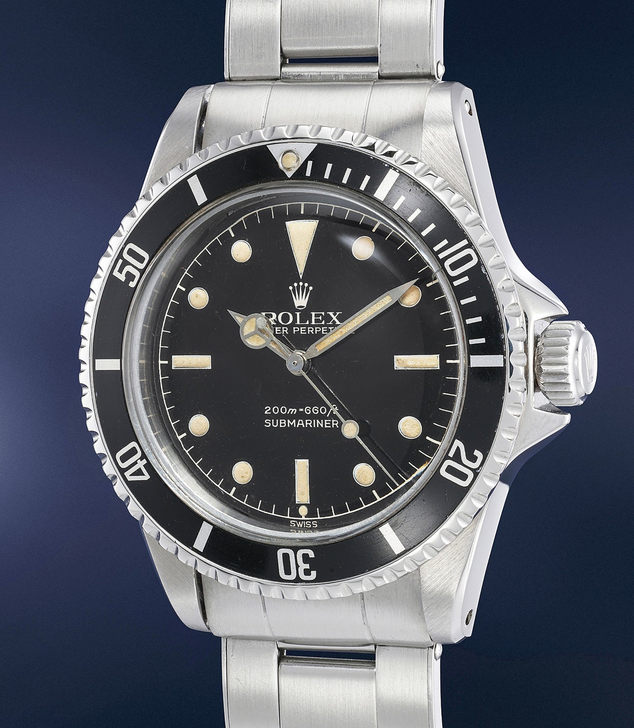 Like many intricacies of collecting vintage Rolex wristwatches, the various iterations of crown guards have developed their own nicknames and followings as the design evolved. The earliest were square-shaped, of which it is estimated very few exist. It is speculated that criticism of the bulky square crown guard prompted Rolex to modify the cases they had in stock, giving raise to the “eagle beak” crown guard. Finally, Rolex produced cases with unobtrusive pointed crown guards (sometimes abbreviated by collectors as PCG), as found on the present example. These early Submariners were fitted with stunning black glossy dials and featured either two or four lines of text at 6 o’clock with gilt printing in either silver or gold (or both). By the late-1960s, the crown guards were changed to a rounder design that is still in use today.