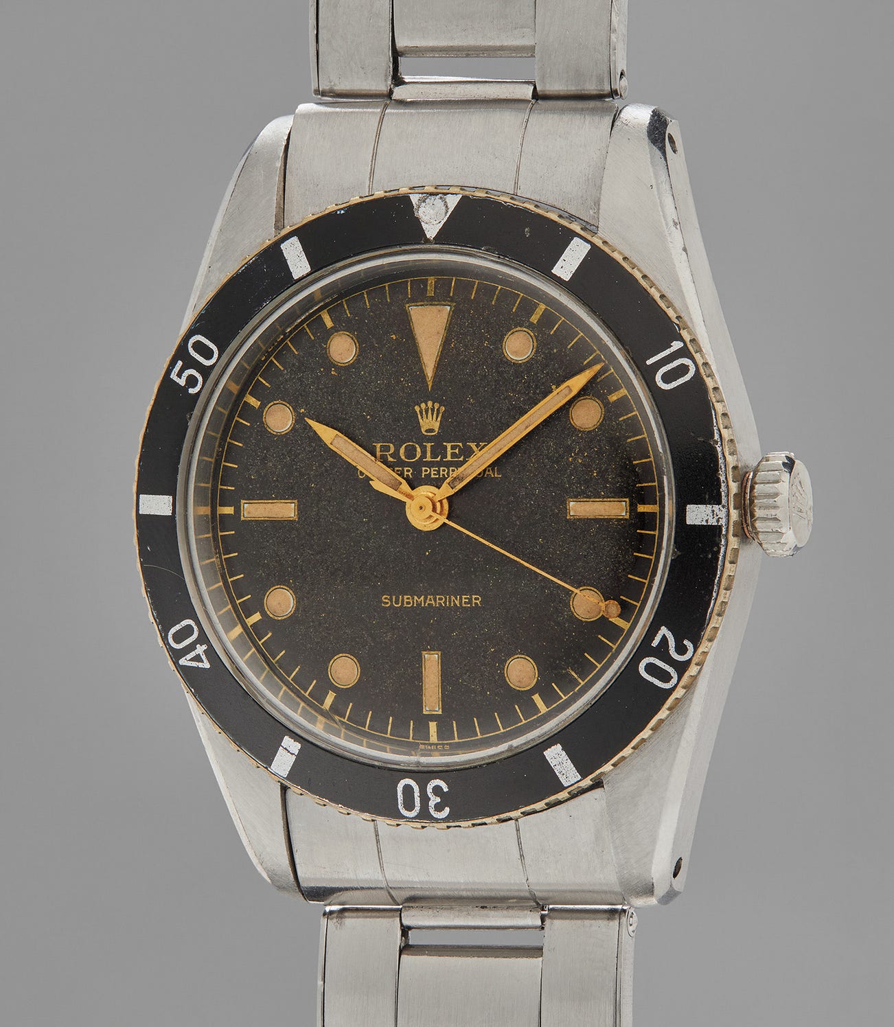 Introduced in 1954 and only produced for a two year period, the reference 6205 is one of the first watches to bear the name Submariner on the dial. Furthermore, it’s fitted with extremely rare and highly sought-after pencil-style hands, which would later be replaced by one of the most distinguishing features on Rolex’s sports model – the Mercedes-style hour hand. The luminous hour markers are original and perfectly intact, along with the original luminous hands – all correctly matching in hue and tone. The early bezel lacks any minute sub-divisions from the 0 to the 15-minute marker as would be found on future Submariner references.