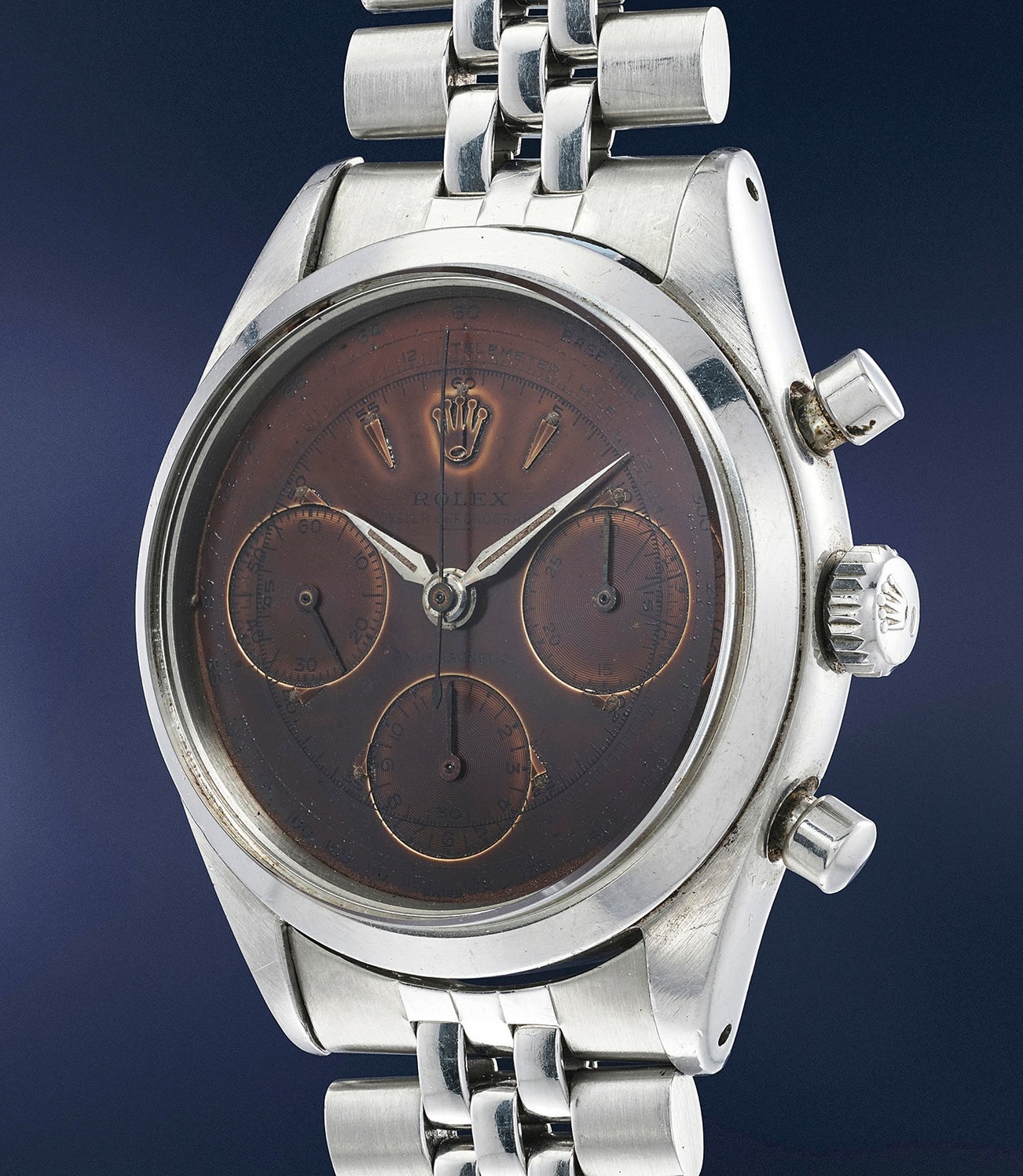 The present watch is an exceedingly striking example, as the dial has turned from white, to an intense espresso brown tone. Such a dramatic color change could only have occurred if the watch was exposed to an extreme source of heat over time. Fortunately, the result is nothing short of extraordinary. Even better, despite the aging of the dial, the luminous material still reacts to a black light. A subtle detail truly sets this watch apart: the underline below the Oyster Chronograph signature, which collectors and historians believe was used to signify a transition from radium to tritium on the dial. The underline is absolutely correct when one considers the serial number.