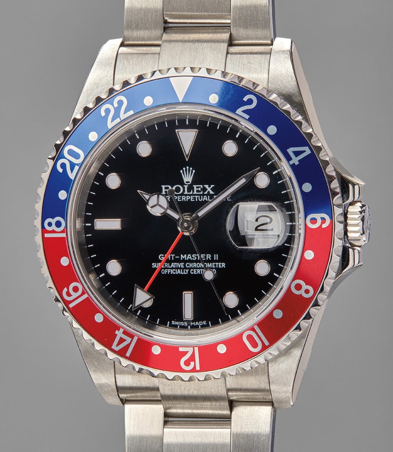 The present M series reference 16710 remains new and absolutely unused with full factory stickers remaining on the case and bracelet. It is especially attractive with its pristine case, rare “error” dial, caliber 3186 movement, and original red and blue “Pepsi” bezel—a complete watch for the connoisseur who seeks an uncommon and rare modern sports watch.
