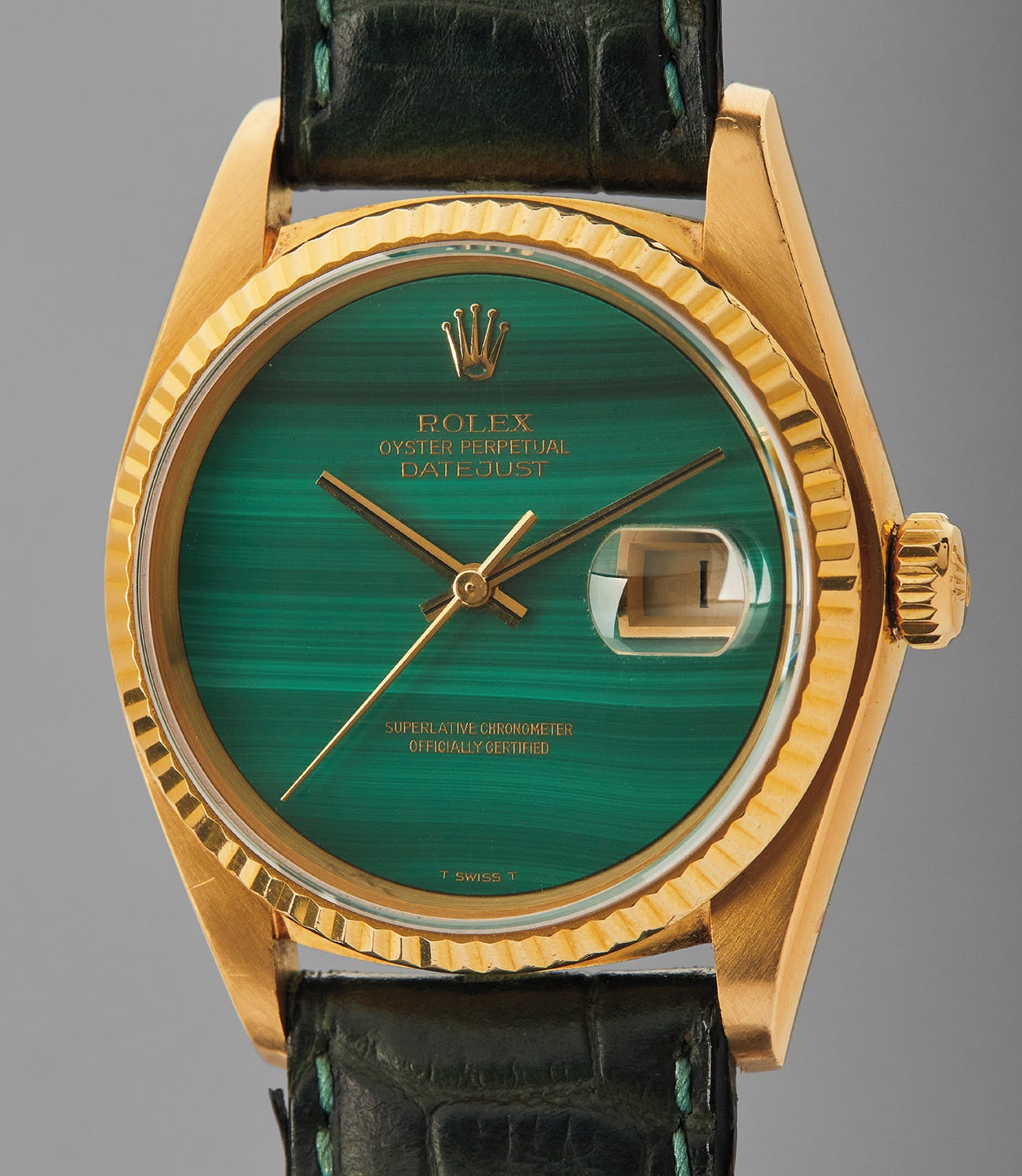 The present Datejust, produced in the early 1980s, pairs the resplendent malachite dial with an immaculately preserved yellow gold case with fluted bezel. It combines the exotic, the elegant, and absolute rarity sure to delight the nascent or experienced collector alike.