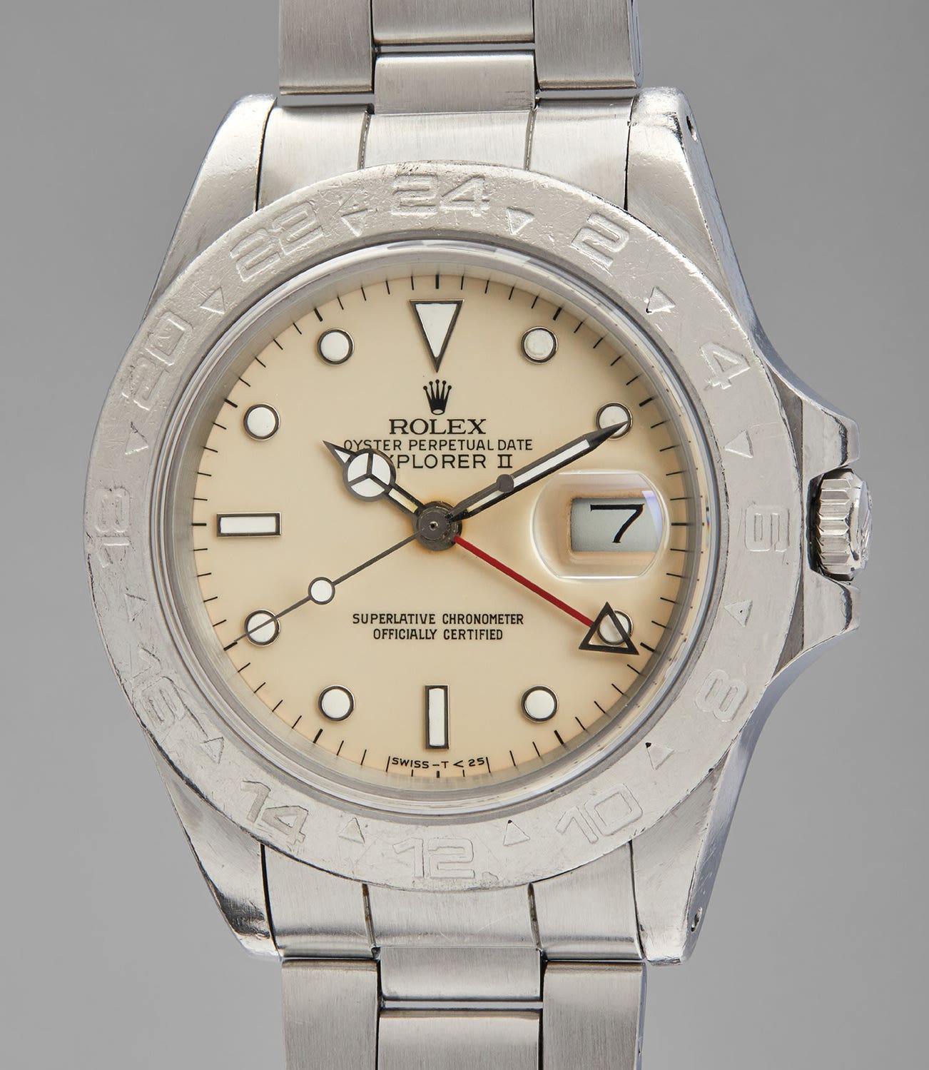 A rare and attractive stainless steel wristwatch with ivory "rail" dial, 24-hour hand, center seconds, and bracelet, sold to benefit the Institute for Digital Archaeology