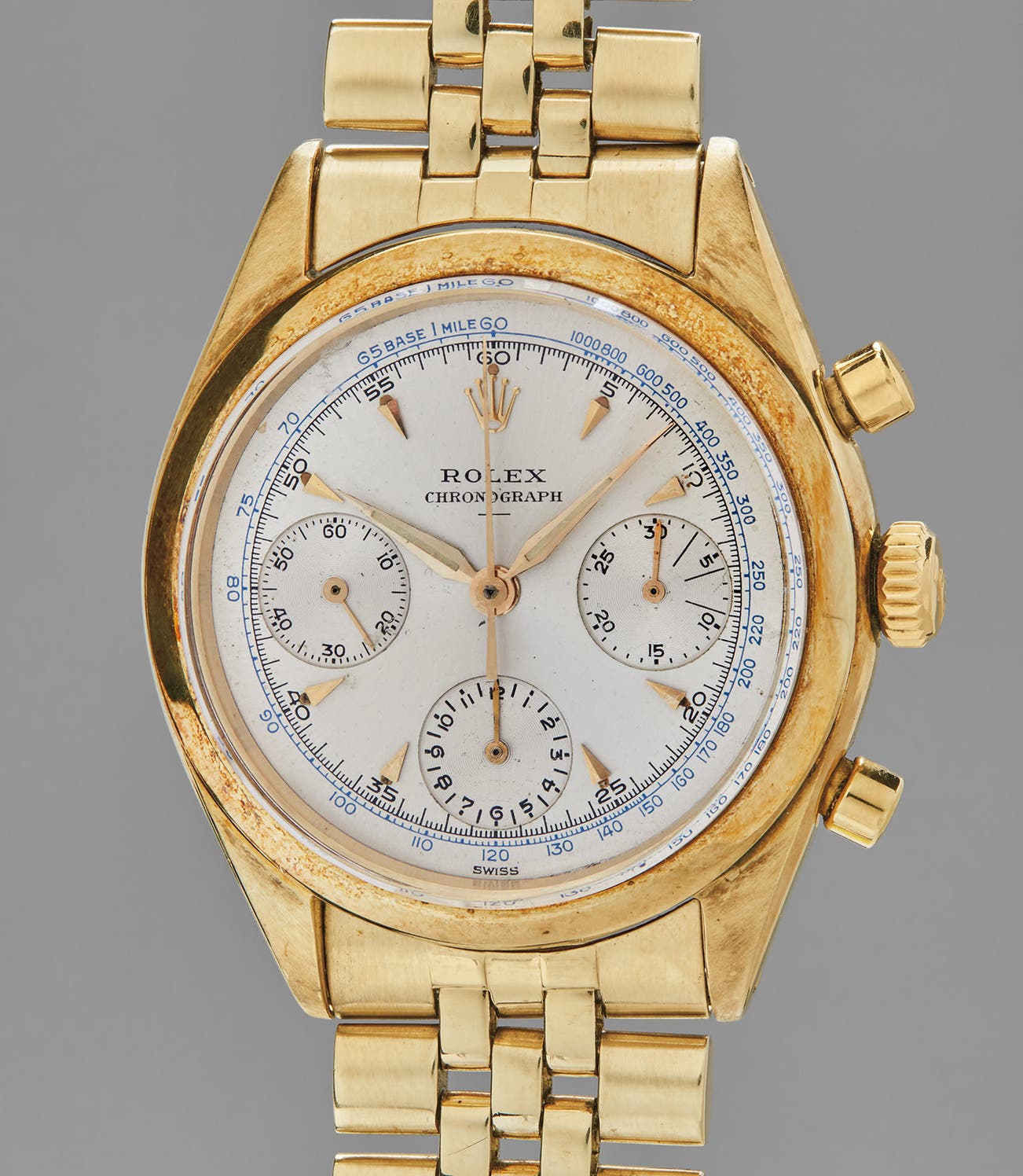 This particular 14K yellow gold reference 6238 is previously unknown and fresh-to-the-market, fitted on its original USA-made 14K yellow Rolex Jubilee bracelet and has developed a beautiful rosy patina. The vibrant, original dial has warmed to pale champagne hue which matches beautifully with the hue of the case and bracelet, allowing the blue tachymeter scale to pop. It is an exceedingly rare opportunity for the Rolex chronograph aficionado.