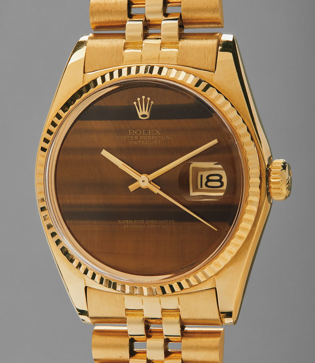 The reference 1601, such as the present watch, was in production from 1959 until 1977 and featured a fluted bezel along with the “pie-pan” style dial with outer sloping minute track. Rolex embellished their Datejusts and Day-Dates with additional flair and exuberance by creating delicate hard stone dials to replace the typical silvered dials. Only highest-quality semi-precious stones were sliced and fitted within precious metal (and in rare cases, stainless steel) Datejust cases. These hard stones include jasper, rubellite, coral, lapis lazuli, malachite, obsidian, opal, and ammonite, as well as tiger’s eye like the present lot.