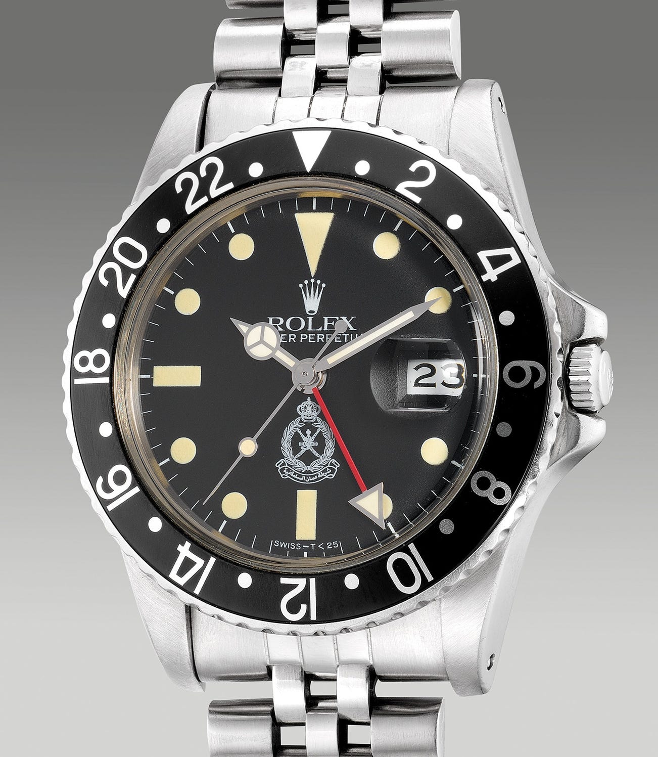 The present example Rolex GMT-Master ref. 16750 from circa 1983 bearing a 7.6 million serial is scarcely stamped with the white emblem of the Royal Oman Police Force. Specifically stamped in white as a colour-coded memorandum, it symbolises “Peace” and “Prosperity”. Introduced in 1981, the ref. 16750 replaced the long-lived ref. 1675 with the introduction of a practical quick-set date feature, with early examples of the reference featuring a matte dial and later examples from circa 1986 fitted with glossy dials. Regarded as a transitional model, the ref. 16750 was discontinued in 1988 and was succeeded by the ref. 16700.