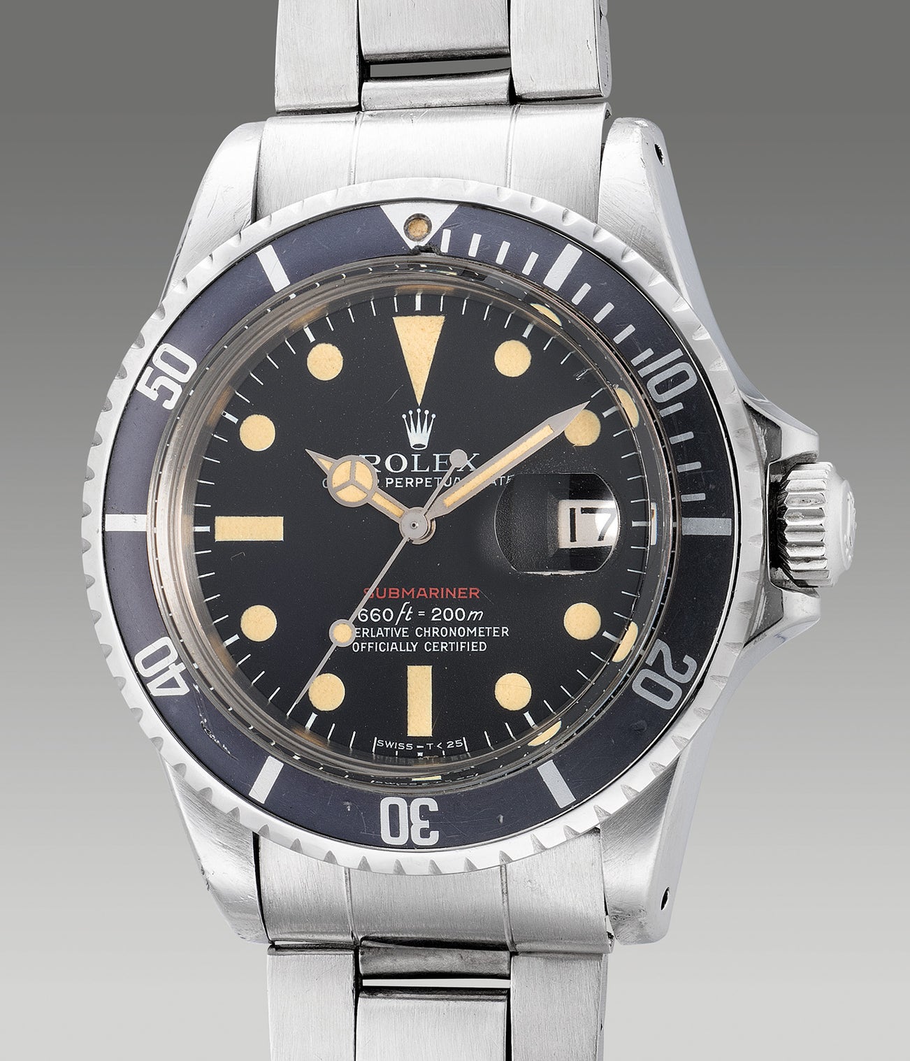 The present example features a Mark V dial, recognizable from the feet first orientation of the depth rating. The red “Submariner” script is printed directly on the dial on the surface without a white base layer and features open 6’s on the depth rating. The bezel has matured to a dark grey shade, furthermore the lume plots have aged to an attractive warm buttery patina. Offered in attractive condition, the contrast of the of grey, black and yellow heightens the vintage appeal of this timepiece.