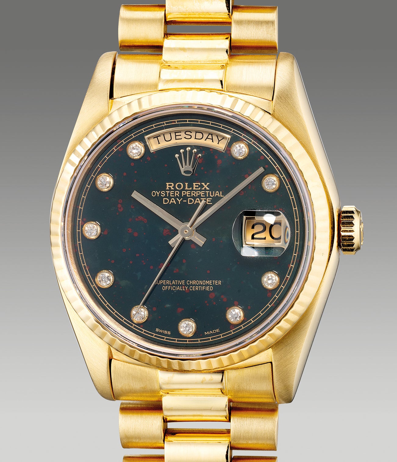 A very attractive and rare yellow gold wristwatch with center seconds, day, date, bloodstone dial, diamond-set indexes and bracelet
