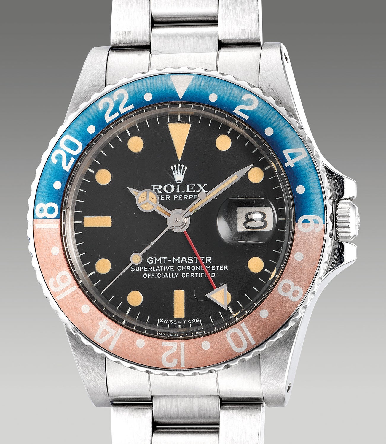 Immensely popular, the present specimen preserved with great proportions and its full accessories embodies incredible vintage appeal. Bearing a 5.1 million serial and fitted with a Mark IV matte dial identified via the perfect alignment of the right vertical of “M” in “Master” centred with “C” from Chronometer below. Furthermore boosting its charismatic personality, the bezel insert of the famed “Pepsi” have faded into a unique red and blue, with a dial that features luminous plots uniformly aged into a buttery hue with the test of time.