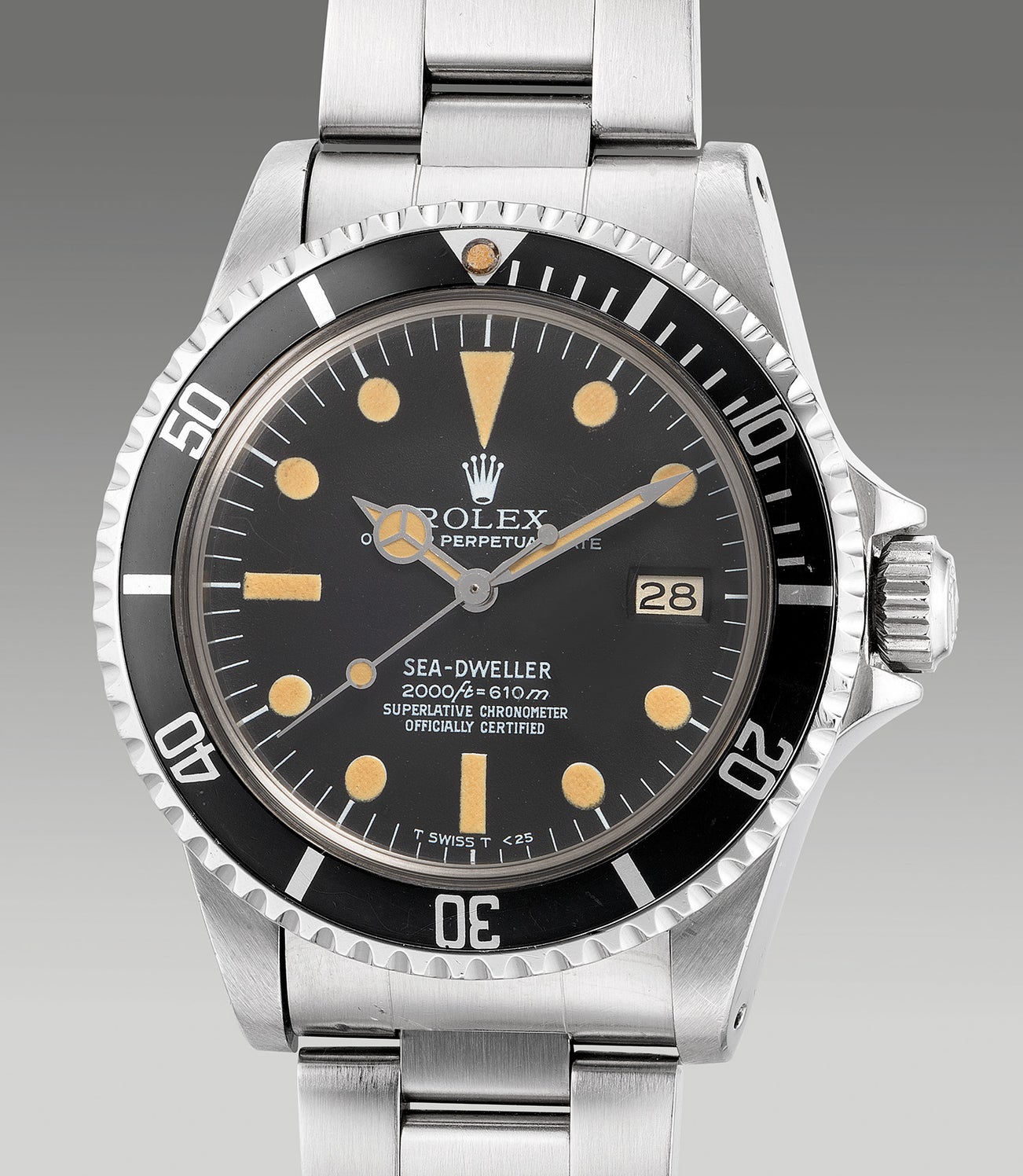Further enhanced by its rarity, the present example is what collectors known as the MK II rail dial variant of the reference. With production for only two years between 1977 to 1979 with a serial number between 5.7 million to 6.2 million, the dials were made by the Stern Company instead of Singer. Elusive and highly collectible, the Rail dial can be distinguished by the subtle details. The “C” of chronometer lines up with the “C” of Certified creating an unusual yet pleasing vertical corridor or rail between the last two lines of the designation is what gives the dial its nickname. It’s worth noting that the MK II variant is also the only Sea-Dweller that bears a “T SWISS T <25” amongst all variants.
