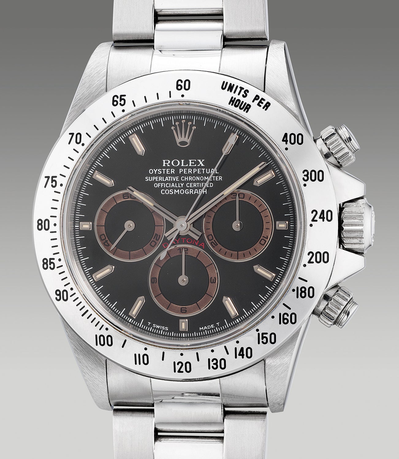 The present example Rolex Daytona ref. 16520 from circa 1995 bearing a “W” serial with “tropical” brown registers is offered with its full set of accessories and in excellent overall condition. The uniformed tropicalization of the registers will surely impress discerned collectors seeking for a splendid specimen of this coveted reference.