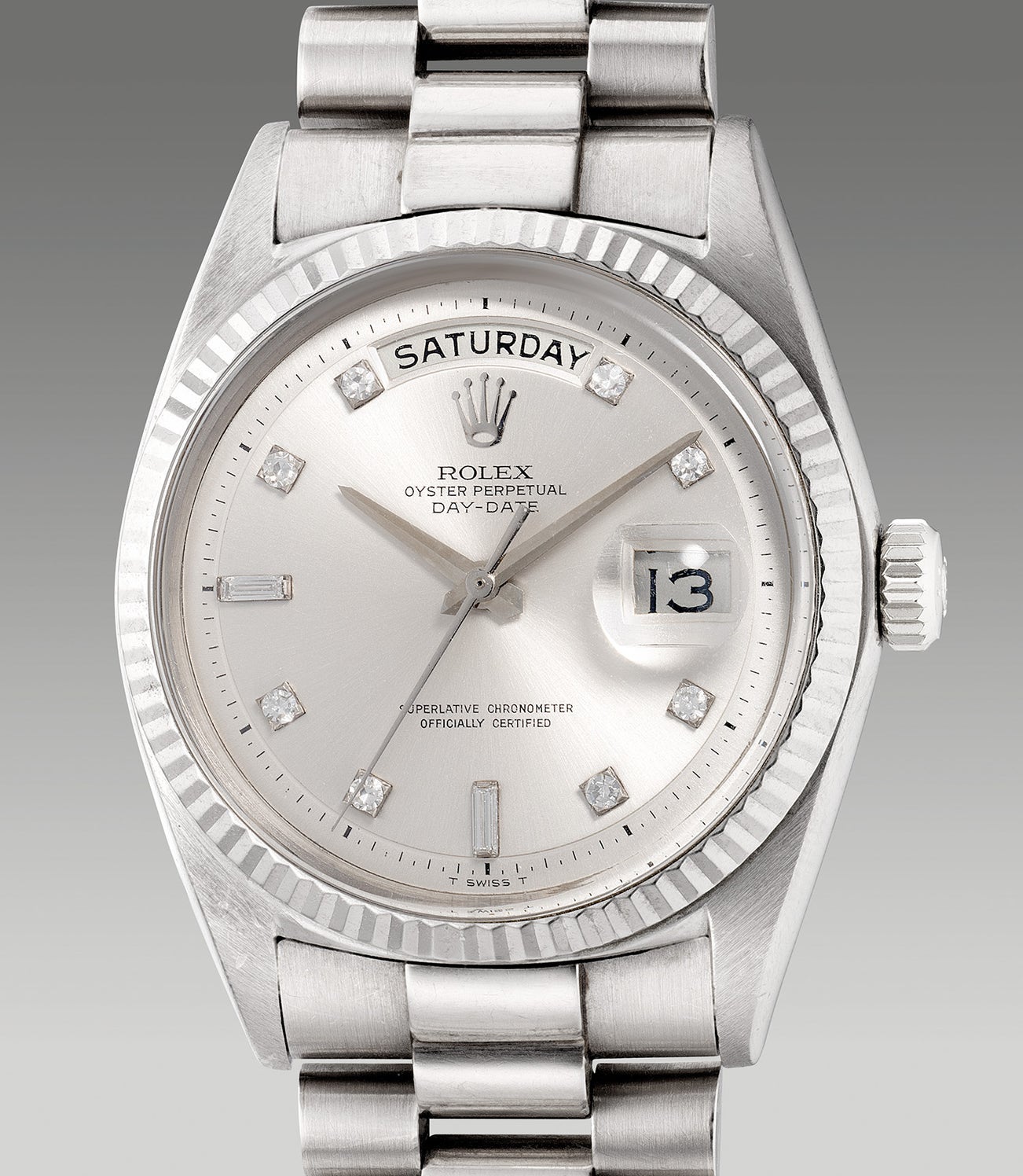 In 1959, Rolex introduced the ref. 1800 series featuring an upgraded caliber with early examples powered by self-winding cal. 1555 and an iconic 36mm diameter case. In 1972, Rolex upgraded the movement to cal. 1556 featuring a hacking feature allowing the seconds hand to stop when the crown is pulled out. Regarded by many collectors as the most important series of Day-Date’s, the wide array of variants catered towards a diverse range of collectors. The reference was discontinued in 1977 making way for its upgraded ref. 18000 series.