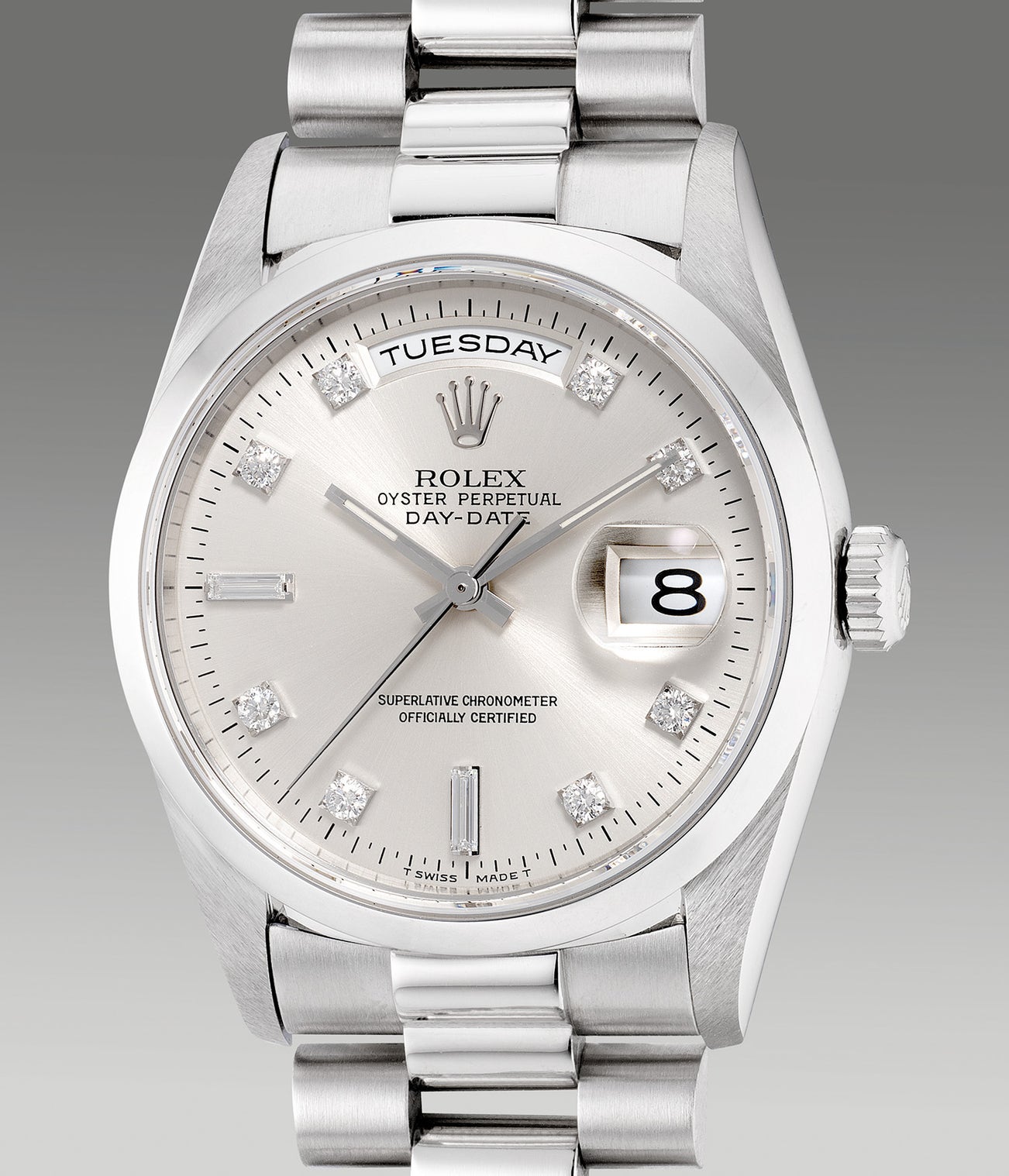 The present example Rolex Day-Date ref. 18206 from circa 1995 is offered in excellent overall condition. Encased in a hefty platinum 36mm diameter case with a smooth bezel, the silvered sunburst dial with diamond-set indexes further enhances the luxurious appeal of the present timepiece. Freshly serviced from Rolex Service Center in Hong Kong, the refreshed appeal of the present example is certainly one to desire for.