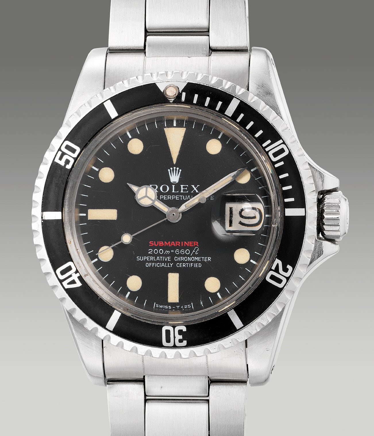Although the Red Subs were scarcely produced with case serials ranging from 2.07 million to 4 million, a total of six marks were featured in the reference, each with its own distinctive traits. The present example bearing a Mark II dial with a corresponding 2.24 million case serial features Red ‘Submariner’ lettering printed over white, with open “6’s” and an elongated “F” for feet. Presented in attractive overall condition, the present example is charmed with a dial in excellent overall condition with evenly aged luminous materials on the indexes and hands that have developed a buttery hue over the years, giving the present timepiece and exemplified vintage appeal. Furthermore, the present ref. 1680 still has its original well-preserved crystal with Cyclops intact.