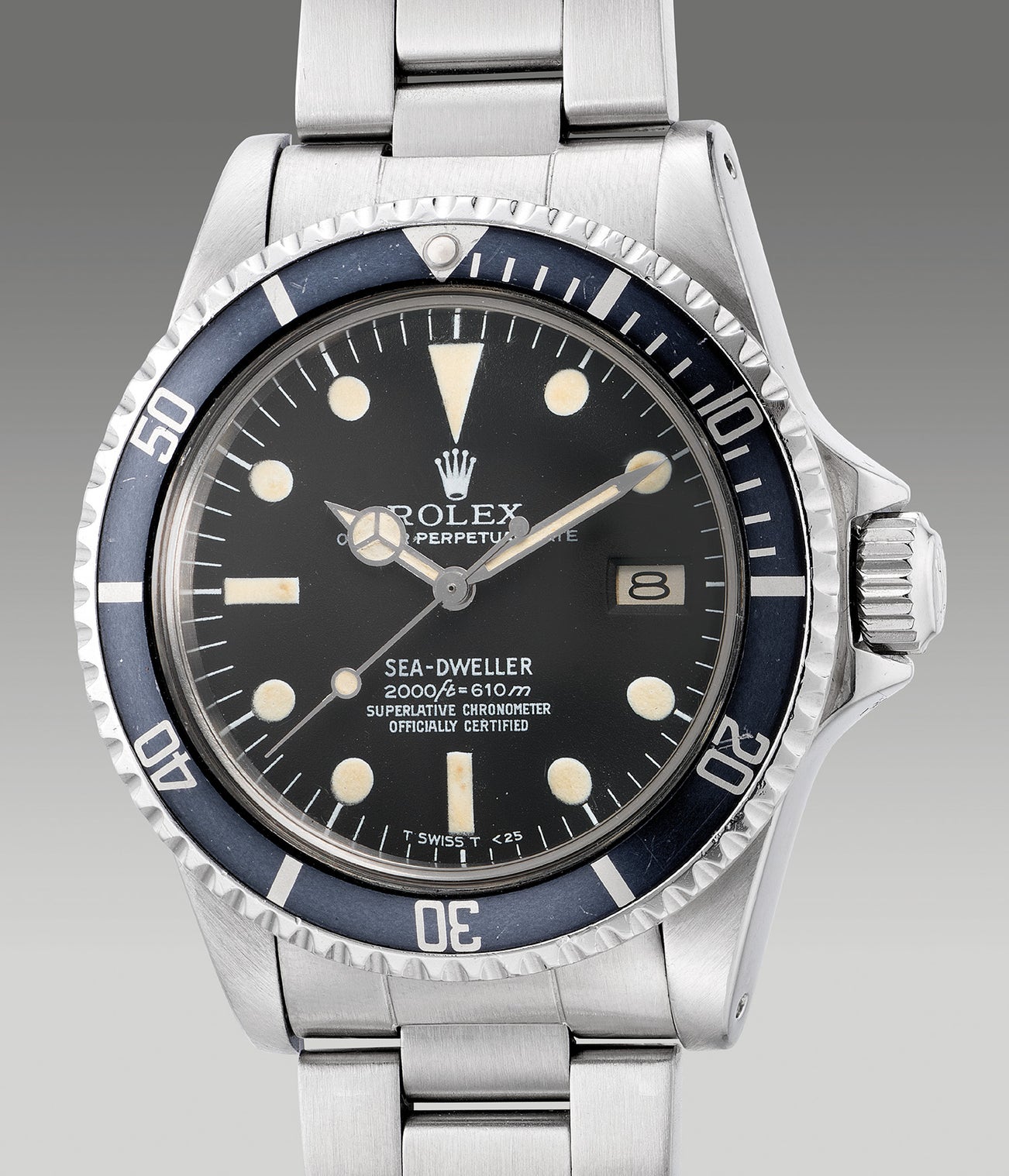Most notably, the last “E” of “superlative” and the “Y” of “officially” are perfectly aligned, as are the “C” of “chronometer” and “certified”. This creates a very pleasing and unusual vertical “corridor” (or rail) of space between the last two lines of the designation, and it is what gives the dial its nickname. Another detail unique to the Rail Dial is the Swiss designation reading “T Swiss T < 25”: no other Sea-Dweller dial, including the Comex 1665 (whose dial was made by Stern as well) presents this designation.