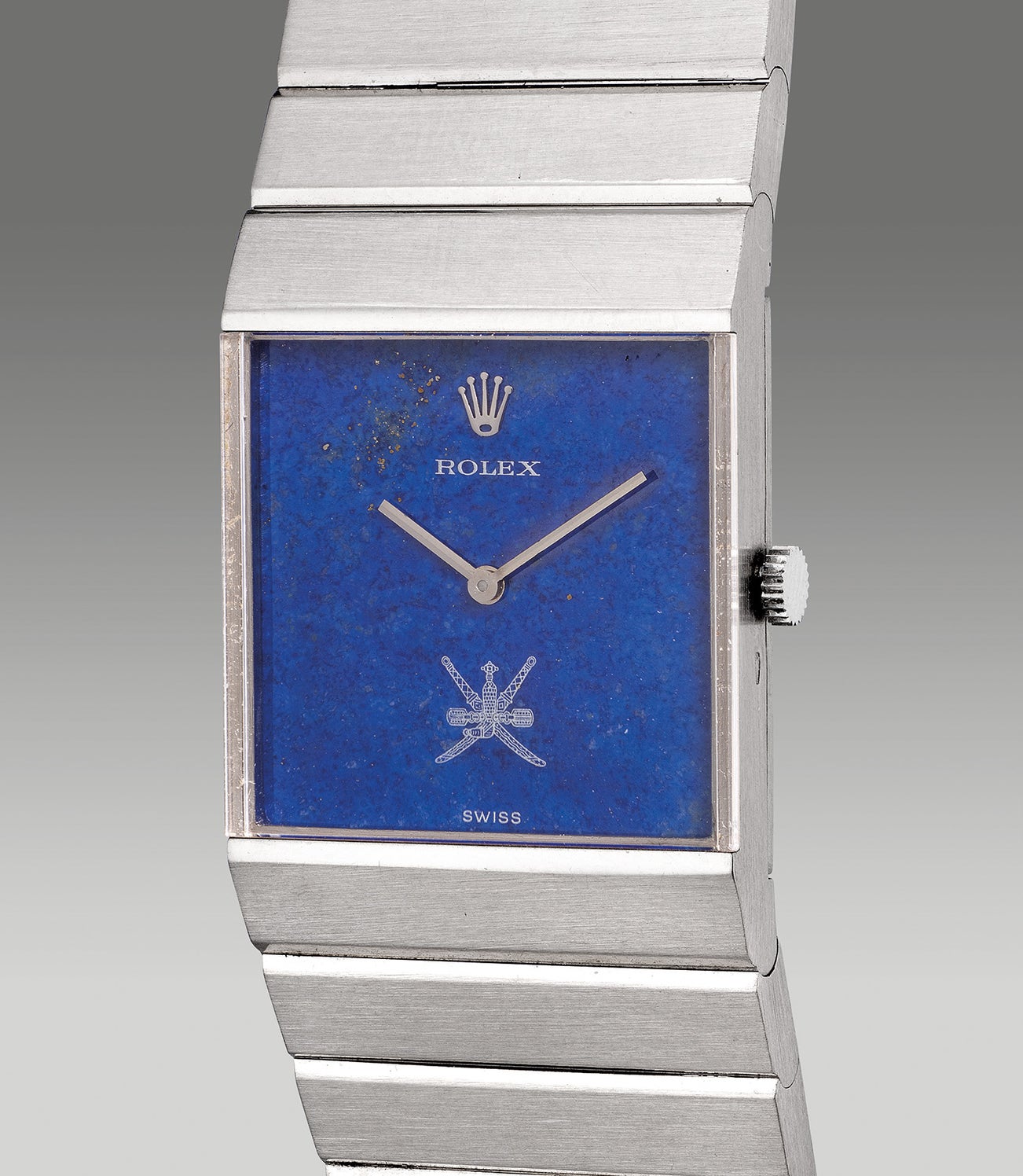 An extremely fine and rare white gold rectangular-shaped wristwatch with “Khanjar” lapis lazuli dial, bracelet and presentation box, made for the Sultanate of Oman and retailed by Asprey