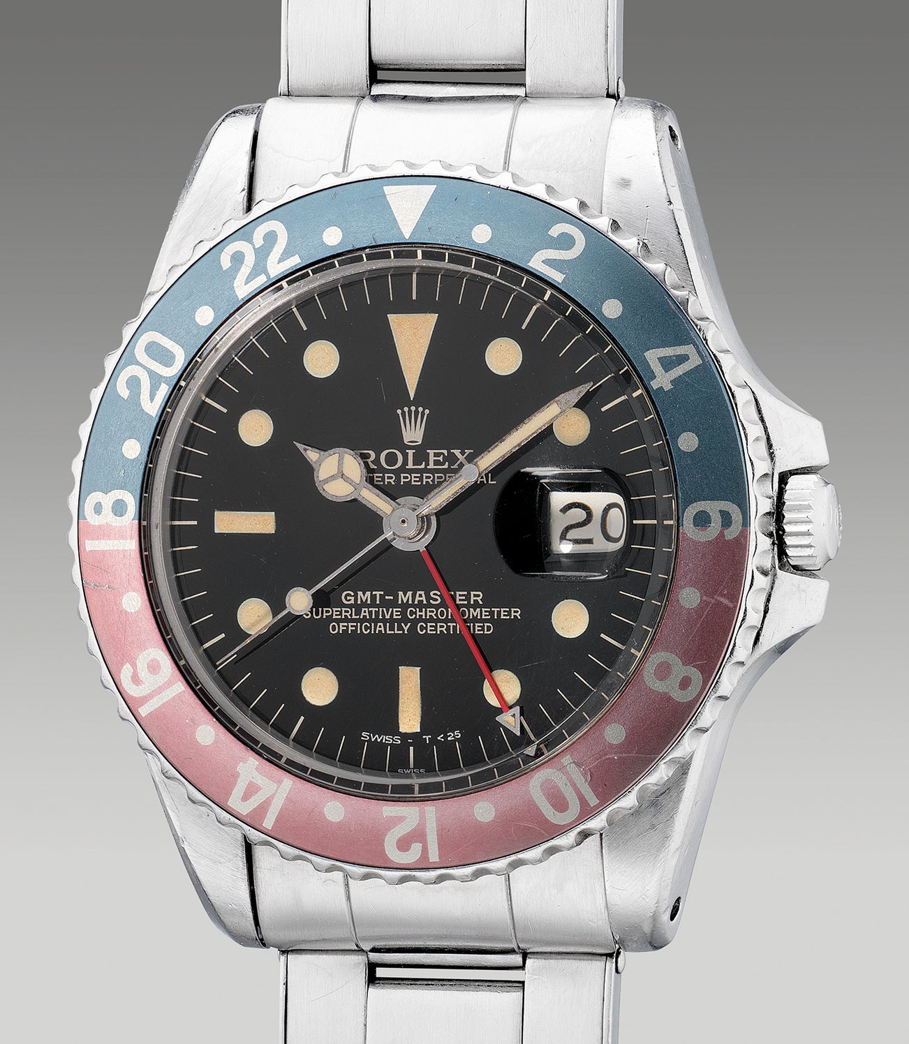 Extremely rare and incredibly well-preserved over 6 decades, PHILLIPS is honoured to present such example for the first time. The present specimen bearing a 1.09m serial has a beautiful faded red and blue bezel, against the ultra-attractive rich black glossy dial, the luminescent plots have also aged with incredible vintage appeal. Furthermore, the timepiece is accompanied with a period correct riveted bracelet that completes as a trophy piece for the discerning GMT aficionado.