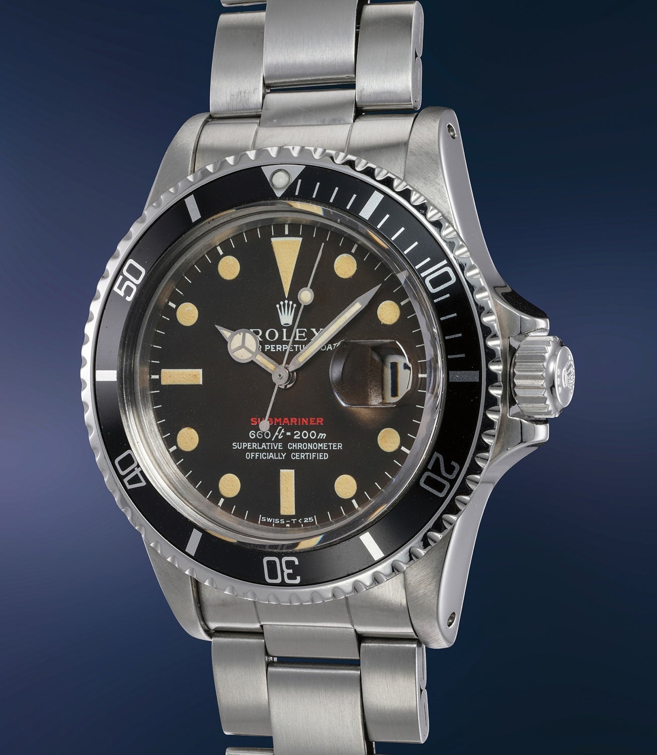 Launched around 1967, reference 1680 was the first Submariner model to be fitted with a date function. In production until the end of the 1970s, the model presents a notable evolution, with earlier examples featuring red lettering for the Submariner designation, and later examples white lettering instead. Red Subs are today extremely sought-after timepieces in virtue of their aesthetic quirkiness and of their historical importance as the first Submariner examples with date. Even within the Red Submariner family of dials, one can notice an evolution of the graphics with 6 variations (Marks). The present specimen features a Mark IV dial, recognisable by its feet first configuration (it is in fact the first “feet first” dial - a modification speculated to find its origins in the increasing prominence of the American market for Rolex at the time) coupled with the “open” 6s of the depth rating. It is also the only feet first dial to have the red print applied to an underline white plot. Mark IV dials can be found on examples from about 2.45M serial to about 3M - a production frame which mostly overlaps with MK V dials.