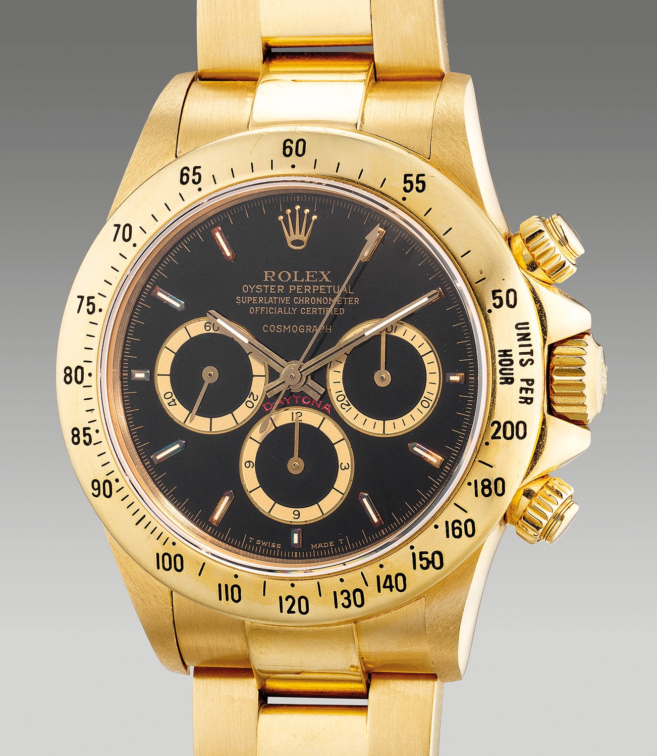 The present example in yellow gold features the coveted floating placement of the “Cosmograph” designation on the dial with an inverted six in the subdial at 6 o’clock. Produced for only one year from 1988 until 1990, this remarkable variant can only be found on examples bearing an “R” or “L” serial number. Part of the L series, the present specimen is also fitted with the period correct Mark 1 bezel with 200 units scale and unit per hour text at 3 o’clock mark. Highly collectible with incredible rarity, the connoisseurs with keen attention to details will notice an interesting feature on the dial.