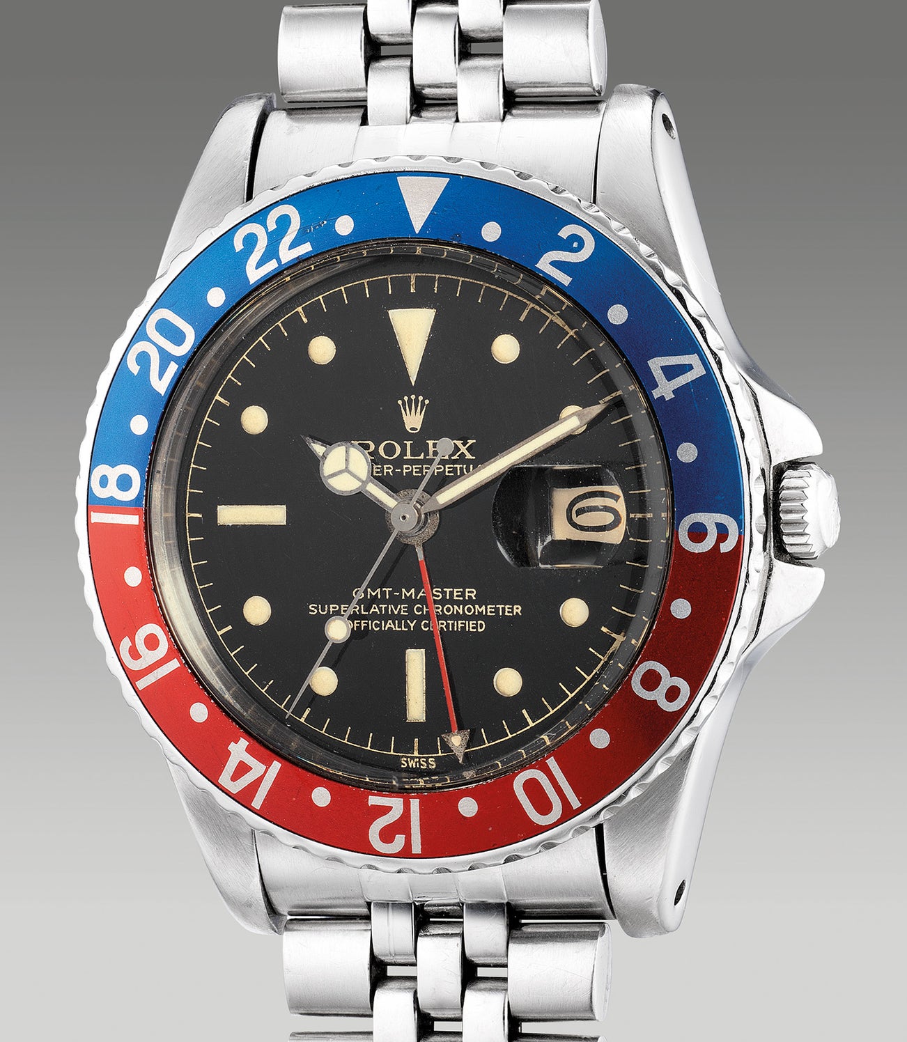 Exceptional and rare from the 1960s, the present example bears a 695’XXX serial which embodies many desirable traits of early iteration of the model. Notably for its pointed crown guards, also known as the “IL Cornino” (Italian for horn), these are the very first case used for the ref.1675 and are highly collectible. The period correct SCOC dial belongs to the earliest Type 1 variant, characterized by its distinct narrow base coronet with small crown hole. Furthermore, the rich glossy black dial with gilt printed chapter ring has developed beautiful spidering that heightens its incredible vintage charisma. Complimented with thick luminous plots that have aged into a pleasing soft beige patina, the present specimen of an early 1675 in great condition is a marvelous addition to the distinct collector of vintage Rolex timepieces.