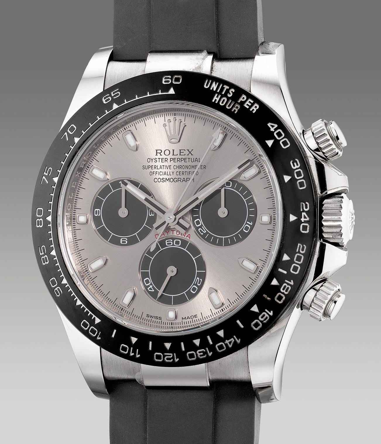 The present lot, a white gold Daytona 116519LN, is a culmination of all of Rolex’s developments until its launch in 2017. In addition to the automatic movement and Chromalight mentioned, this watch features an imperishable Cerachrom bezel, a parachrom overcoiled hairspring for accuracy and an Oysterflex bracelet for comfort. However, the most remarkable feature of this watch compared to non-precious metal references is perhaps hidden in plain sight: the white gold case on this Daytona is forged from Rolex’s very own foundry, allowing it to create its proprietary gold alloys and to achieve a quality and consistency that no other watch manufactures can claim.
