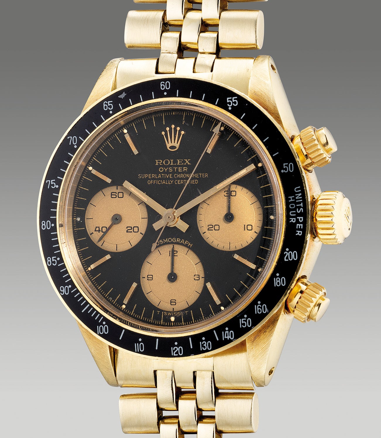 With an ever growing interest for vintage Daytona’s, collectors today seek for quality and rare examples of the coveted timepiece and over the years yellow gold examples have had a significant increase in both value and demand. During the period, yellow gold examples were produced in both 18K and 14K gold, with 14K gold made to cater towards the American market, such as the present example. During this period, Rolex modified the dial layout for gold versions, and the "Officially Certified Chronometer" designation was printed on the dial. Furthermore, the period also witnessed an additional movement number stamped next to the caliber number below the balance wheel signifying the movement to be chronometer certified.