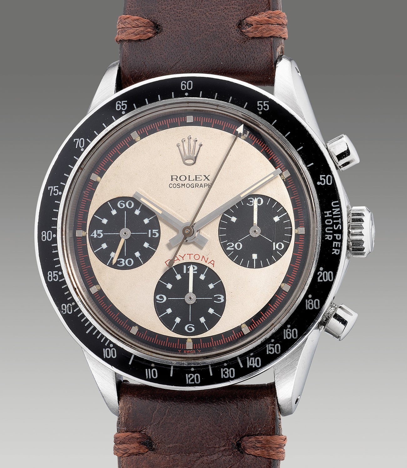 While the reference alone is rare, examples featuring the exotic tri-colored “Paul Newman” dials made by Singer are extremely rare. The dial is identical to the ref. 6239 famously worn by Paul Newman, with specific traits that sets the tri-colored exotic dial apart from other references featuring a “Paul Newman” dial. Featuring an ivory-hued main dial, the black registers are noticeably “stepped” with its white rectangular-tipped hashes running all the way to the edge of the step. Furthermore, a keen eye may notice the slanted “T SWISS T” featured in red writing underneath the 6 O’clock position with other references featuring a flat “T SWISS T”. Moreover, the case for the reference were produced with two profiles with examples made before 1966 featuring a rounder appearance with examples later featuring a rather oval appearance.