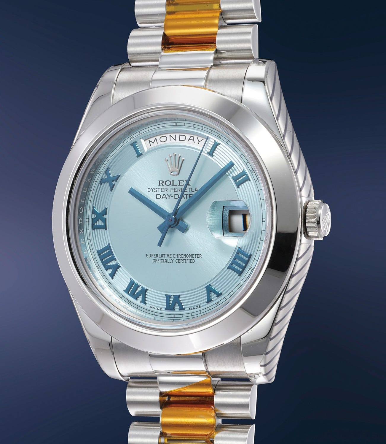Presented in new old stock condition and further accompanied by the original guarantee and box, this platinum example leaves the beholder stunned with its ice-blue dial. Usually reserved for its platinum models (for example, it is also present in the dial of the platinum Daytona) the blue hue Rolex achieved is sublime and subtle: not too cold as to result “soulless”, but also restrained enough to impart a sense of gravitas to the watch. A number of dial configurations are found on this reference, the present one being one of the most complex, featuring a double finish: large concentric guillochage for the hour track and sunburst for the center. The discrete outer railway minute divisions and the Roman numerals, both executed in exquisite “ton sur ton” shades of blue, complete the ensemble.