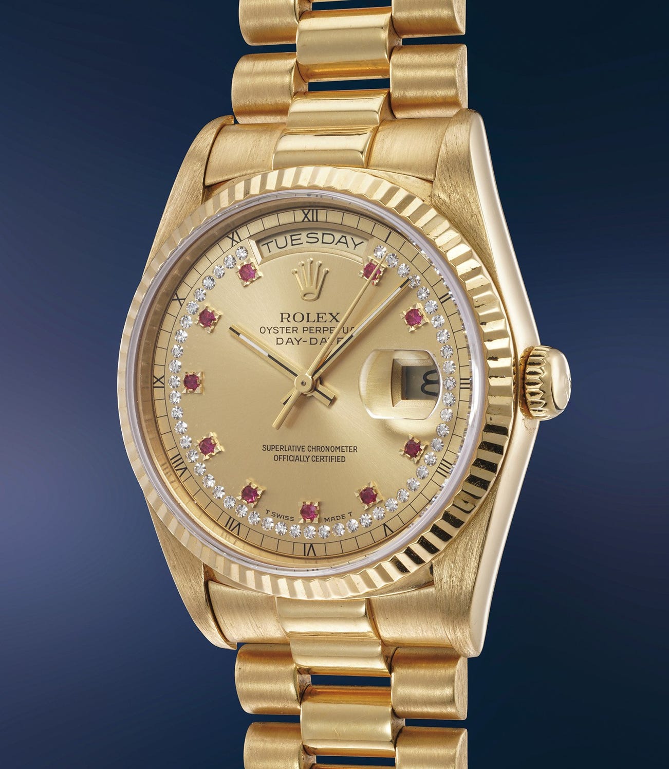 This rare variant of reference 18238 is fitted with a dial displaying a charming champagne sunburst finish, and furthermore fitted with ruby-set hour markers and diamond-set minute divisions, classifying it as one of the ultimate luxury pieces produced by Rolex in the 1990s, a true apogee for the collector of high end and bejeweled timepieces.