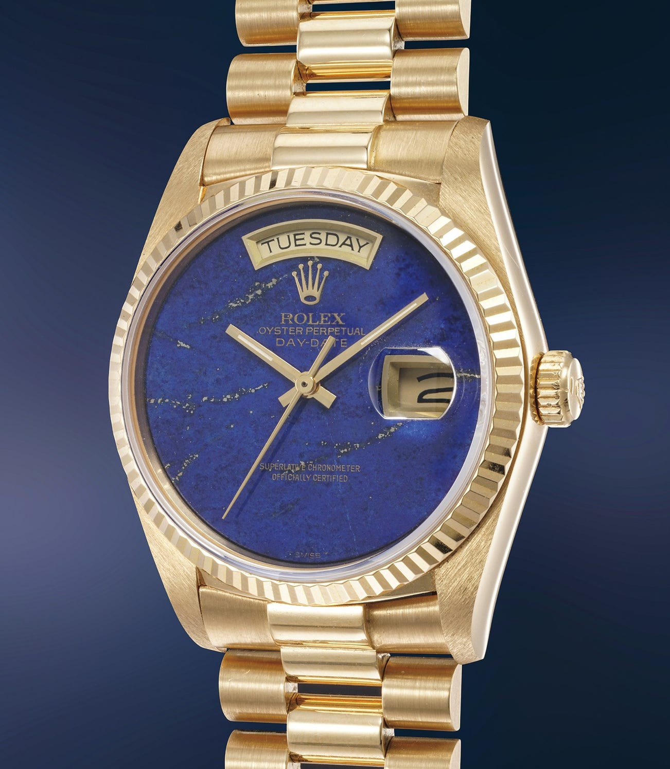 Adorned with a shimmering fluted bezel, the present yellow gold Day-Date reference 18038 displays a highly desirable lapis lazuli dial. This very example is particularly rich and saturated in tone, with strong gold and copper inclusions that pair wonderfully with the yellow gold case. The hour markers have been removed leaving the dial pure to express its penetrating colour to its fullest.