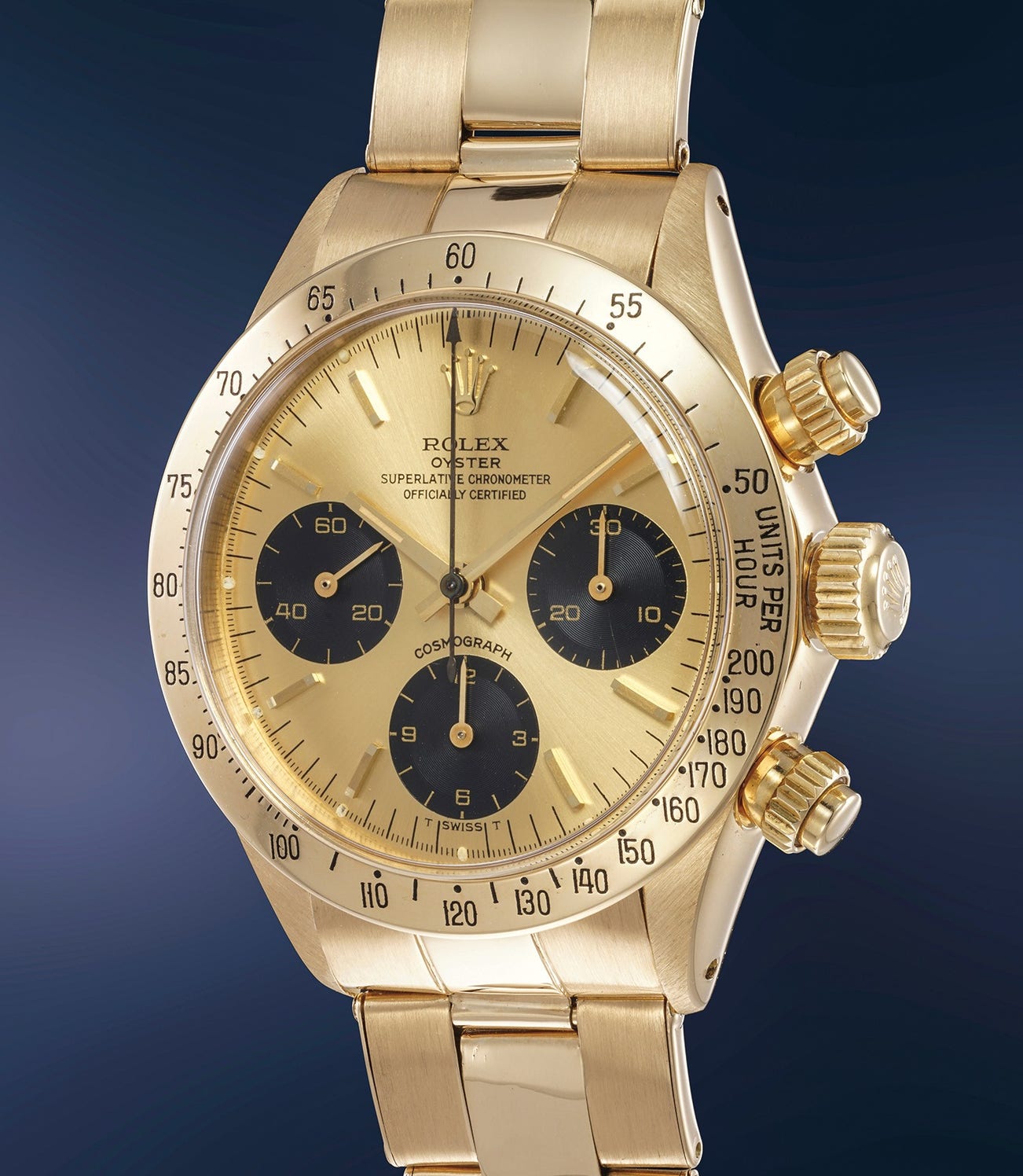 The present watch is fitted with a superlatively well preserved champagne dial, highlighting its warm and luxurious aesthetic impact. Not only the dial is devoid of any mark or scratch, but the case as well is in equally well-preserved condition, with sharp edges, strong satin finish and very little signs of wear. Compounding to looks and condition, the watch comes with a "71" endlinks riveted bracelet - also in excellent condition-, an extremely sought-after rarity in itself. Truly, a collector-class statement piece.