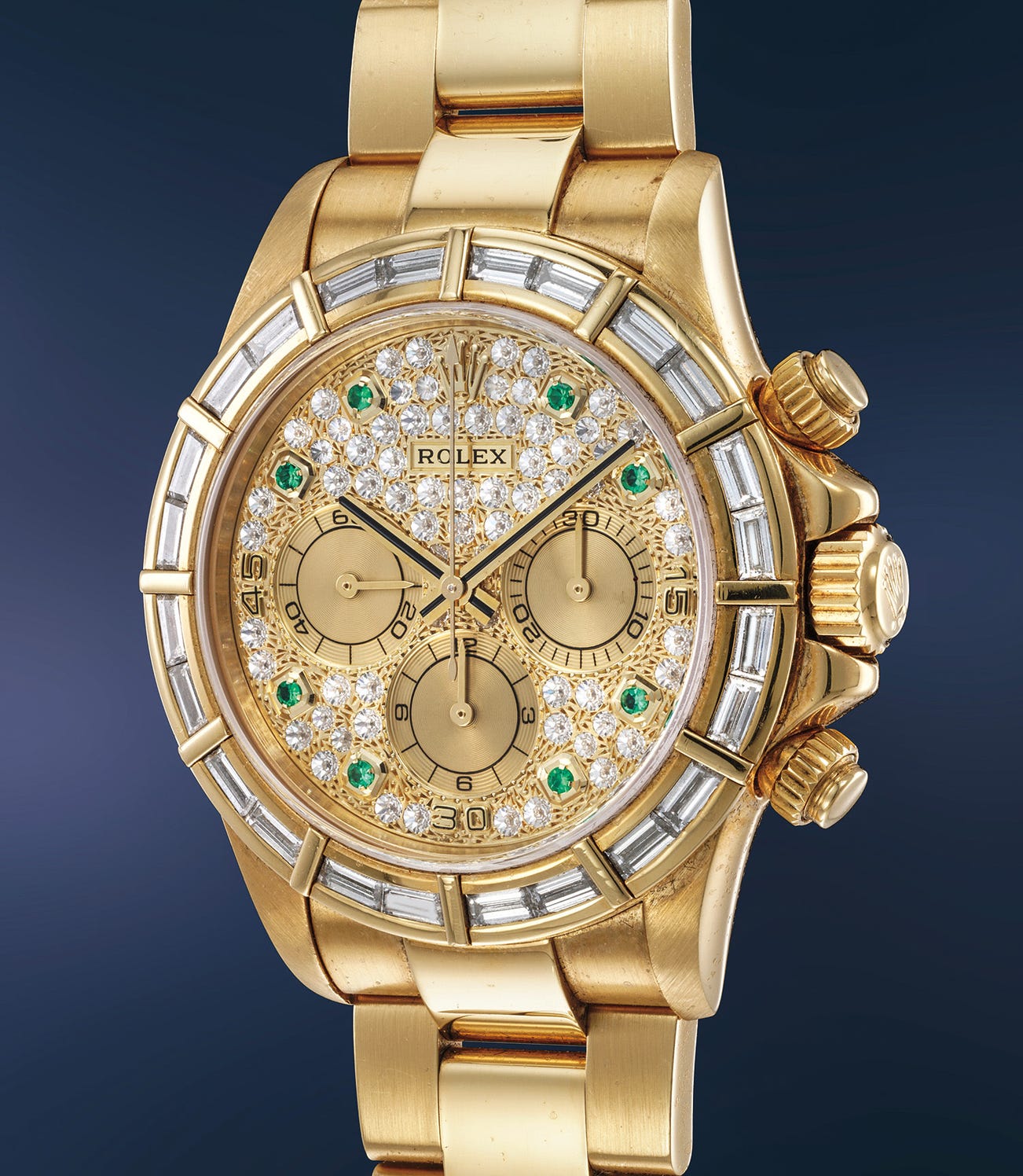 In this 1990s instance, however, Rolex experimented more deeply and realized pieces set with various stones (blue sapphire, ruby, cognac sapphire, to name a few) and with differently cut diamonds: either princess cut or the more impressive baguette-cut diamond, epitomized by this example with emerald-set numerals - one of the most attractive and rare gems found on Daytonas - of the very uncommon reference 16568. The larger stones impart more character to the piece, making it an absolutely unisex statement timepiece in today's fashion.