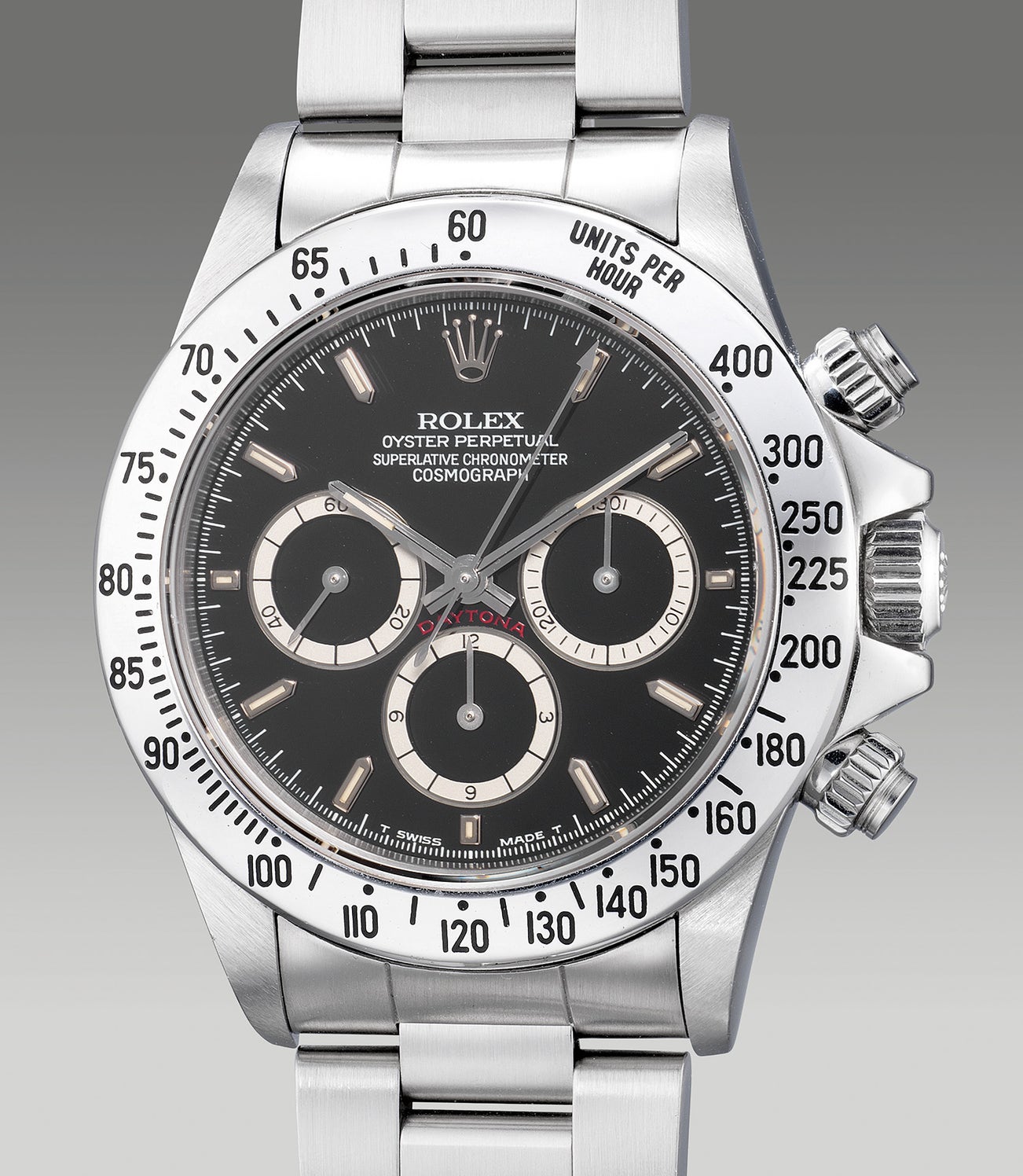 Growing in demand, the Cosmograph Daytona’s evergreen modern design has garnered the attention from vintage collectors all around the globe, and have become on the most sought after sports watch. Produced in circa 1989, the present example bearing an L serial is from the rare and coveted early examples of Zenith Daytona. The first half of the production of the “L” series houses a 4-Liner dial with a MK I 200 units per hour bezel insert, followed by a very short run of MK II bezel like the present example, where the bezel was modified with a scale for 400, 250 and 225 indication, and “units per hour” has been relocated to 1 o’clock position. Adding attraction to this incredibly well-preserved example is the feature of an inverted 6 on the 12-hour register, making this one of the most desirable combination from the series. Furthermore, the present early is charmed with its original guarantee and presentation box, making this a highly collectable chronograph from the era.