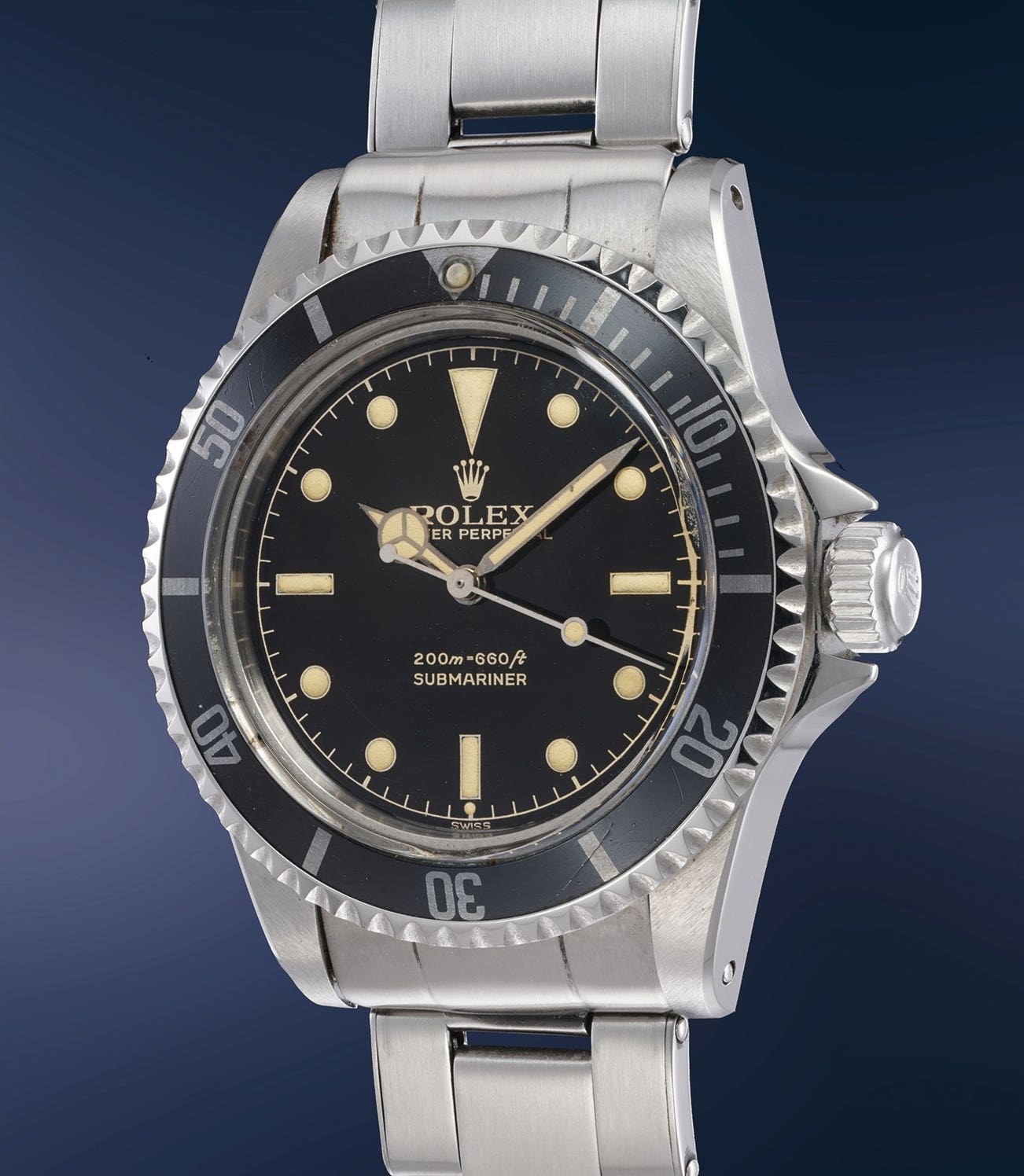 Like many intricacies of collecting vintage Rolex wristwatches, the various iterations of crown guards have developed their own nicknames and followings as the design evolved. The earliest were square-shaped, of which it is estimated very few exist. It is speculated that criticism of the bulky square crown guard prompted Rolex to modify the cases they had in stock, giving raise to the “eagle beak” crown guard. Finally, Rolex produced cases with unobtrusive pointed crown guards (sometimes abbreviated by collectors as PCG), as found on the present example. These early Submariners were fitted with stunning black glossy dials and featured either two or four lines of text at 6 o’clock with gilt printing in either silver or gold (or both). By the late-1960s, the crown guards were changed to a rounder design that is still in use today.